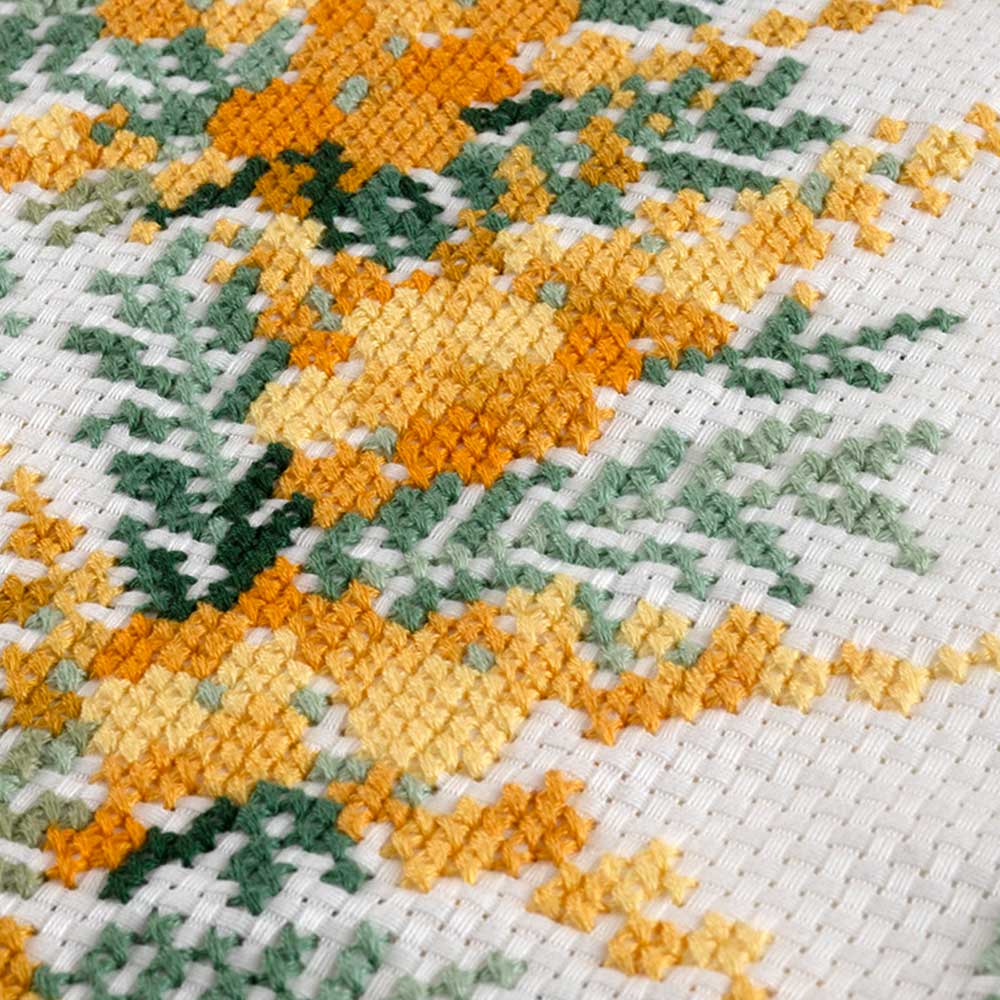 【キット作り方つき】やわらかな黄色の花が可愛らしいミモザのリースを全体に大きく描いた、爽やかなクロスステッチのテーブルセンターです。中~上級者の方向き。6本取りで刺します。
