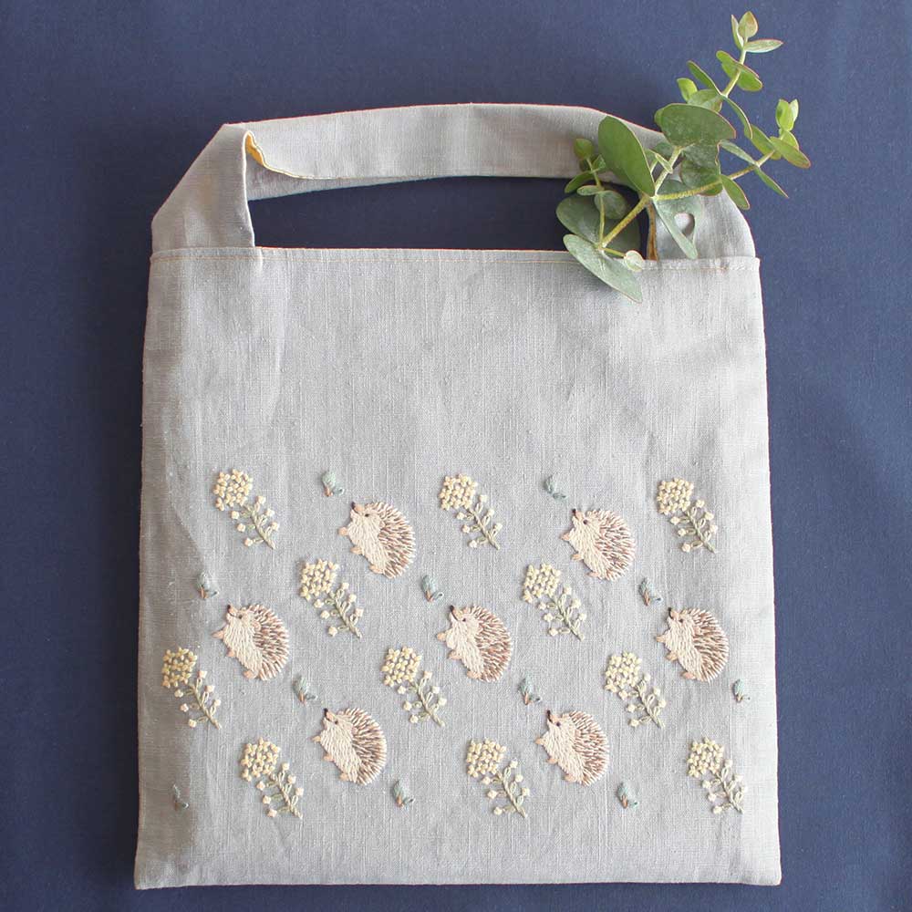 【キット作り方つき】 動物をモチーフにした、可愛らしい刺しゅうが人気の刺しゅう作家Chicchi(チッチ)さんデザイン。はりねずみと菜の花を並べた爽やかで可愛らしいバッグです。図案印刷済みなので、初心者の方でも楽しんで刺し始めることができます。