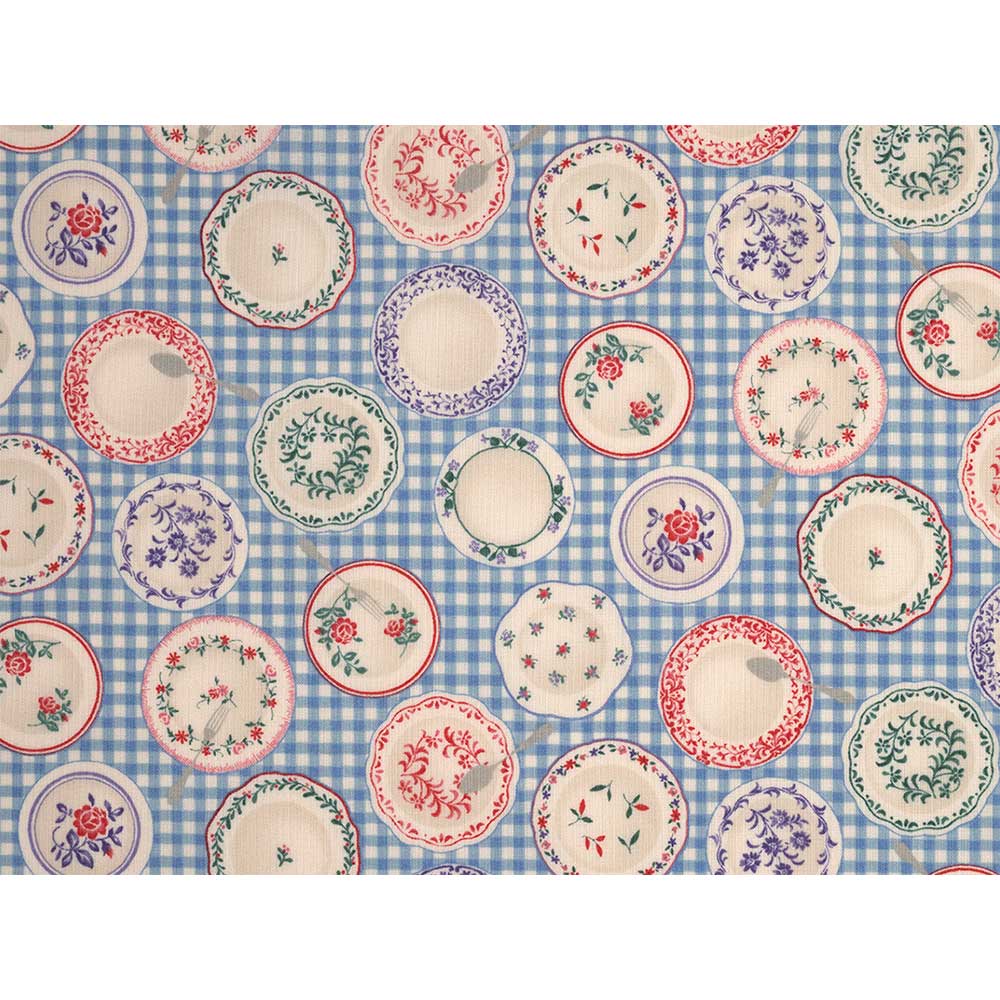 ギンガムチェック柄の上に、おしゃれなデザインのお皿を並べたプリント。ミトンやエプロンなどのキッチンアイテムなどにもおすすめです。