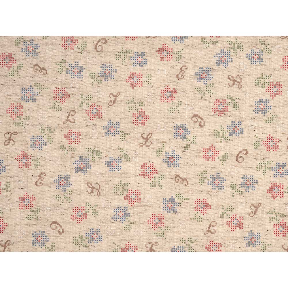 [綿麻シーチング]綿殻入りのナチュラルな綿麻地に、赤と青の小花をクロスステッチしたようなプリントを施した可愛らしいデザインです。小物作りや裏布などにも。