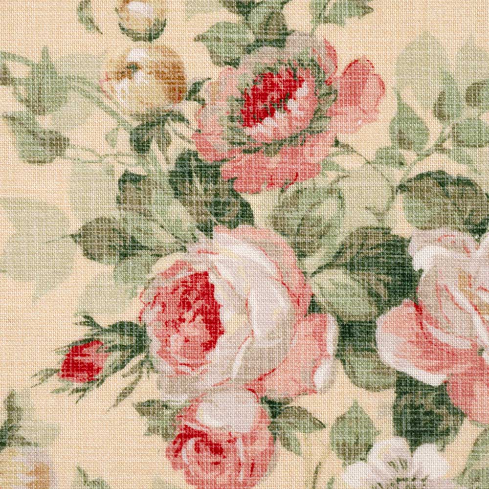 エレガントなバラのブーケを、かすれた風合いにプリントした華やかなプリント。土台布やバッグなどにも。