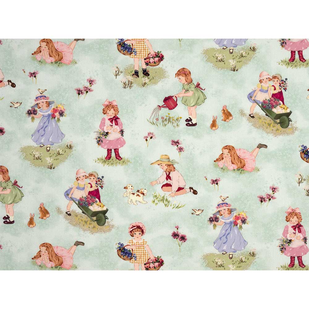 草原で犬と遊んだり、花を摘んだりしている女の子たちを描いた可愛らしいデザイン。ポーチやバッグなどにも。