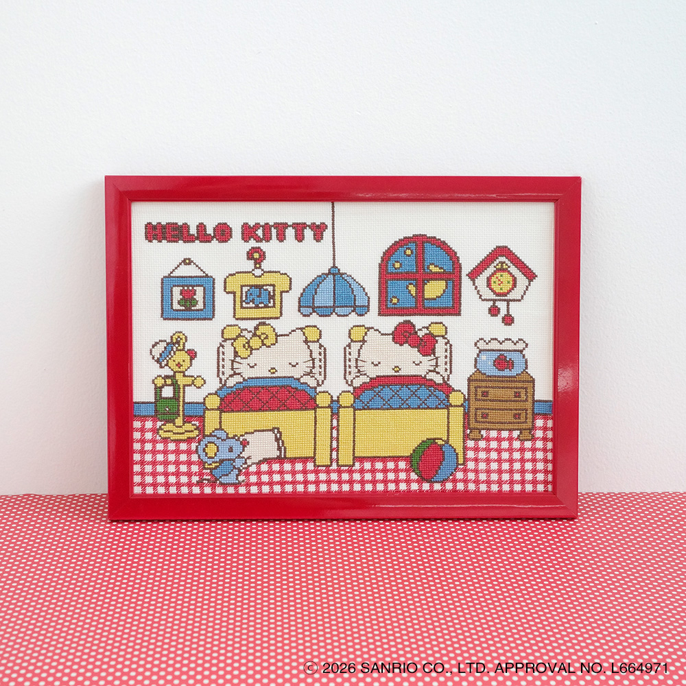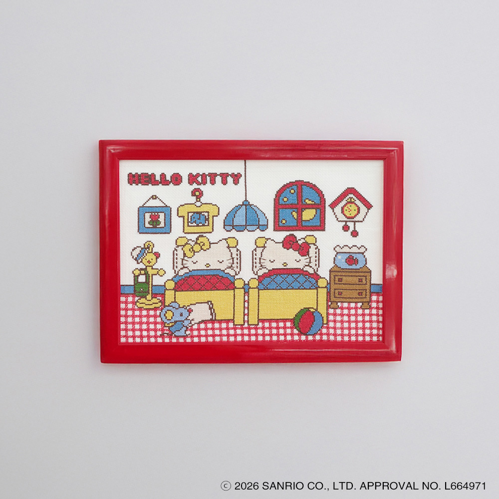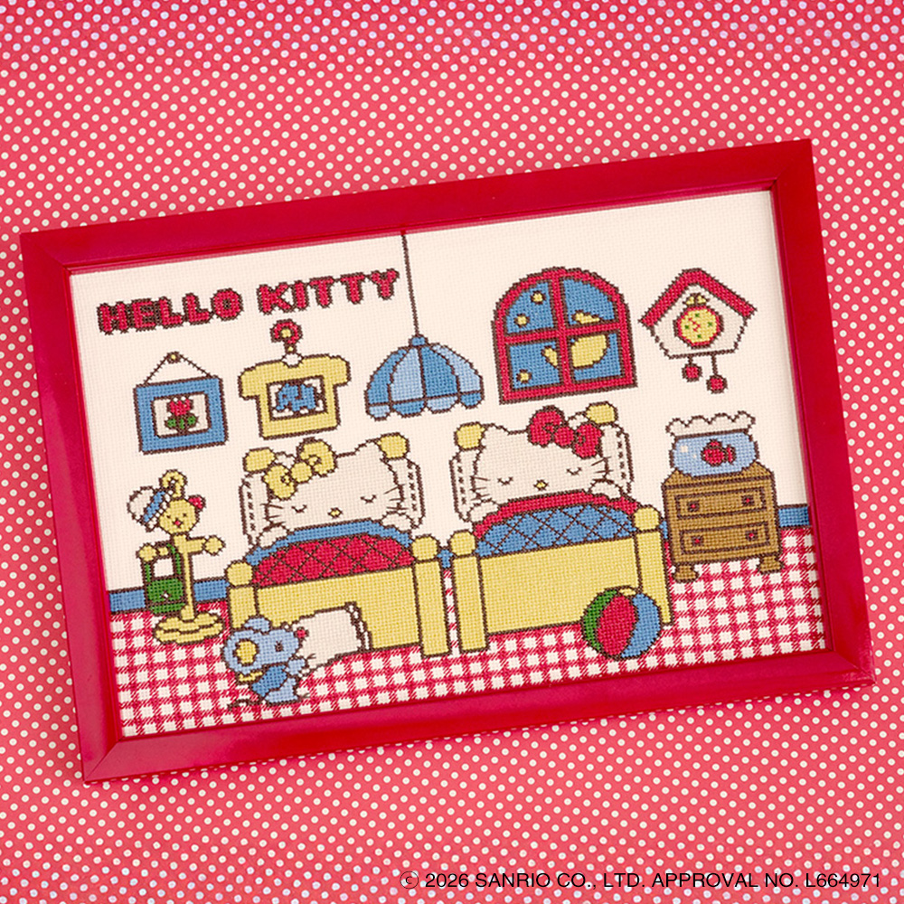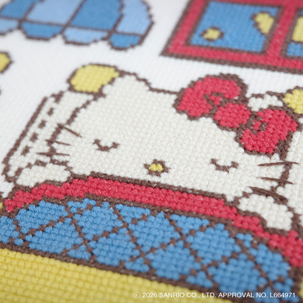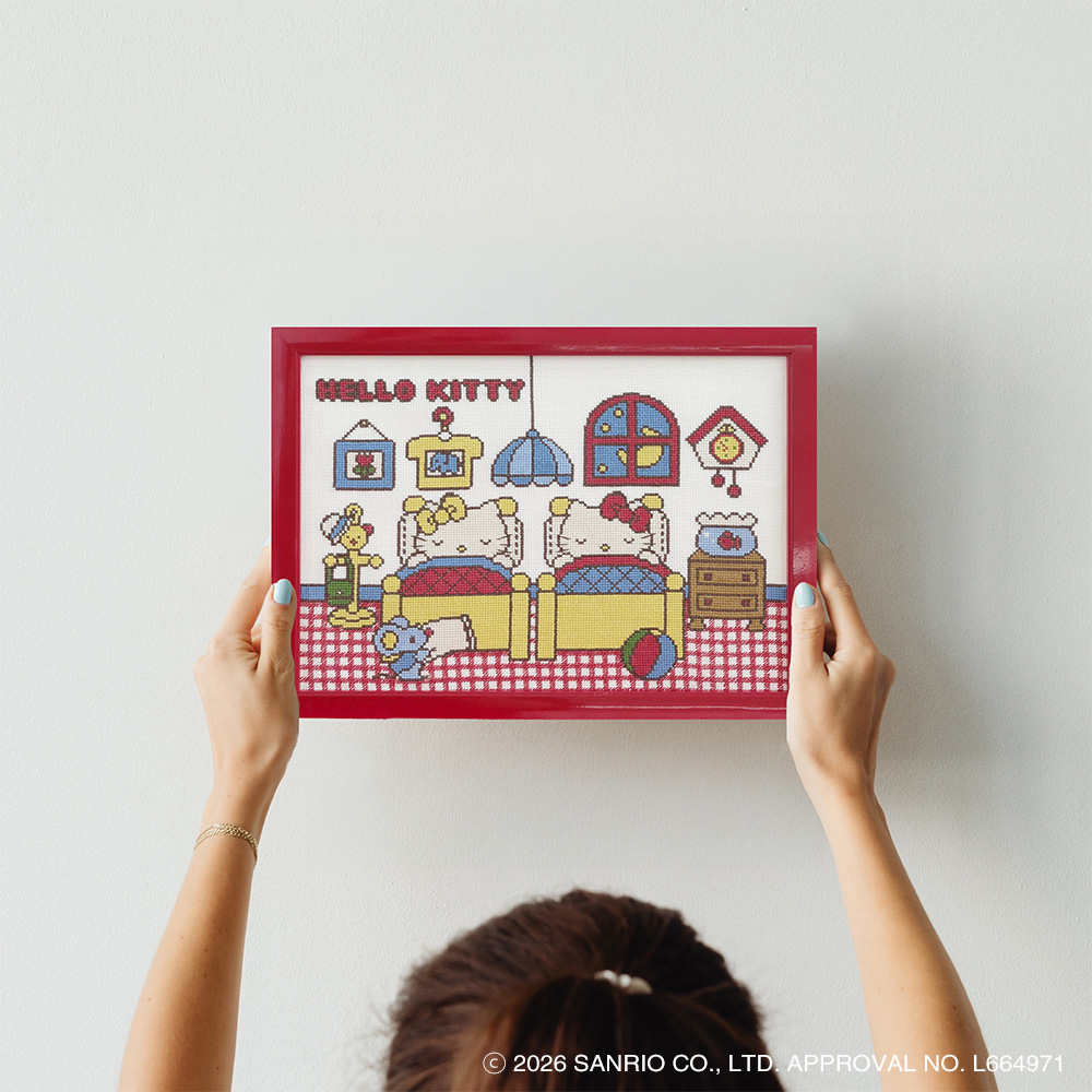 サンリオの人気キャラクター「ハローキティ」と「ミミィ」、 そして愛らしいねずみの「ジョーイ」が登場する、心温まるワンシーンをクロスステッチで表現しました。