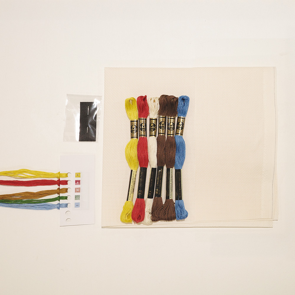 刺しゅう用アイーダ(16ct)、DMC25番刺しゅう糸(8色)、クロスステッチ針、作り方説明書、クロスステッチ図案