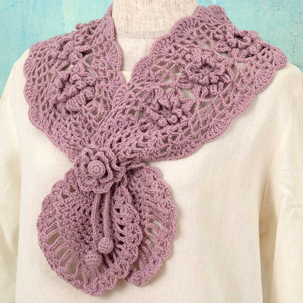【キット作り方つき】人気のかぎ針編みでつくる、可憐な花モチーフマフラー。レーシーでエレガントな仕上がりです。通し口付きで首にくるりと巻いて差し込むだけなので着脱が簡単で外出時もスマート。衿元に上品な華やかさがプラスされ、早春のおしゃれにピッタリです。「花のハンドウオーマー」とお揃いも。糸はエクストラファインメリノを使用した高品質の合太糸。撚りがしっかりしているので、模様編みやメリヤス編み、地模様もきれいに仕上がります。中級以上の方にお勧めです。