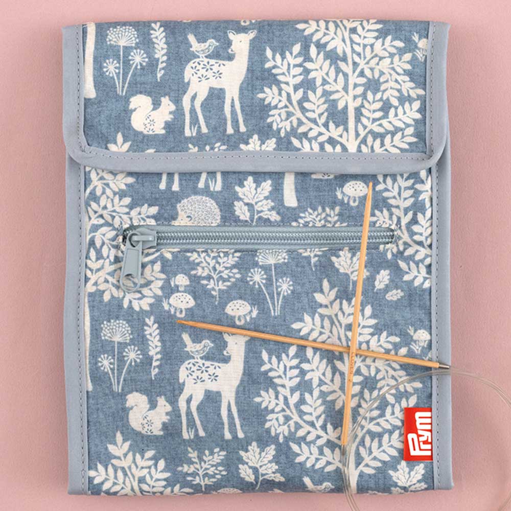 ドイツで愛されている用具メーカーPrym社のニット用具。編み針やアクセサリーをコンパクトに収納できるケースです。外側にファスナー付きポケット、内側に8個のポケットがついています。マグネットスナップ2か所でしっかりと留まるので、持ち運びも安心です。優しいブルーグレー地の森の動植物のプリントがおだやか。