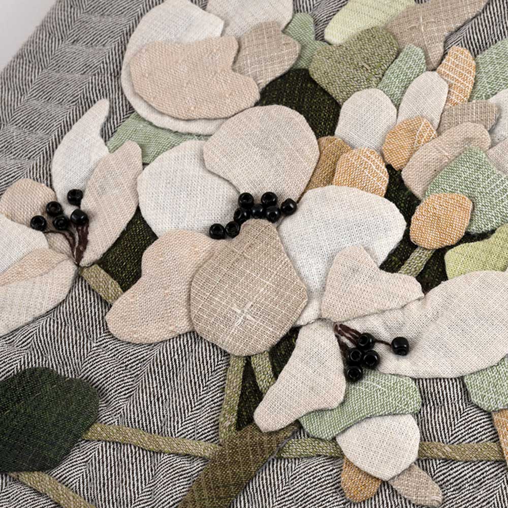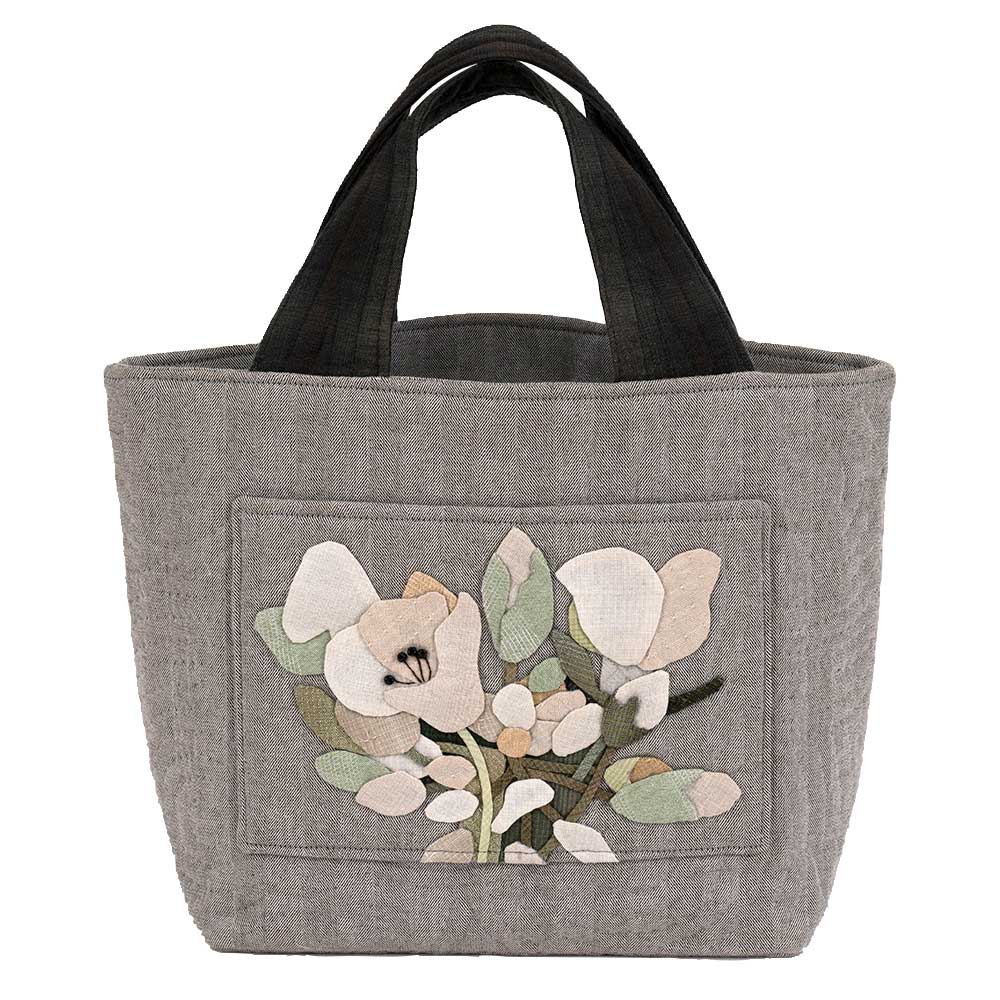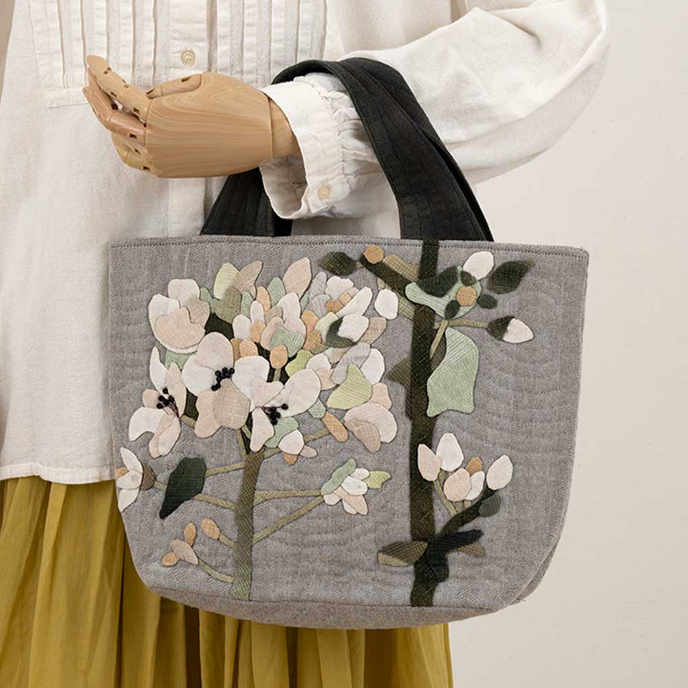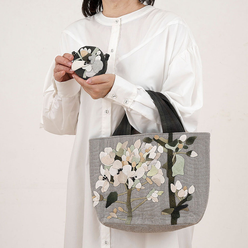 【キット作り方つき】大きくアーティスティックにデザインしたナノハナを、パステル調の先染め布でアップリケ。お揃いの可愛いポーチも作ります。後ろ側のポケットにも アップリケ。花芯は刺しゅうとビーズで仕上げます。