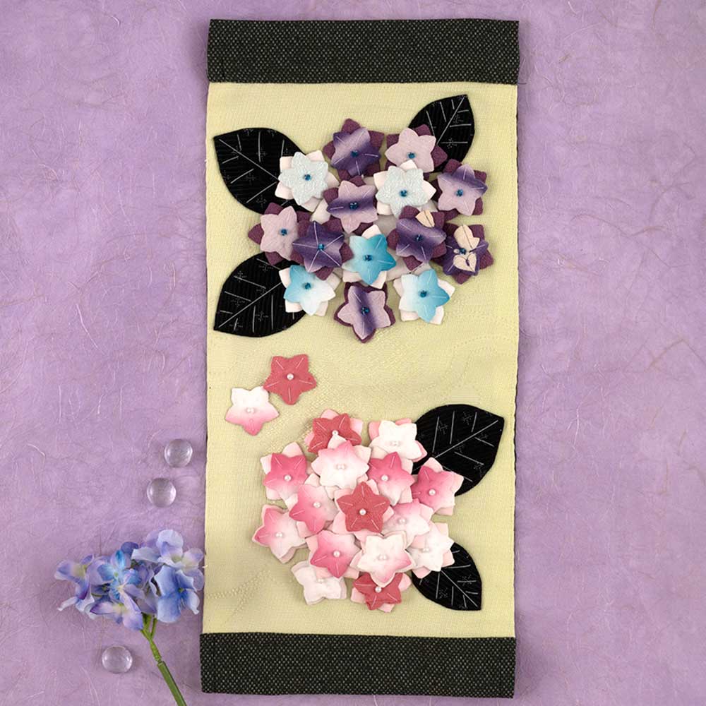 【古裂】【キット作り方つき】初夏を彩るアジサイを、古裂のぼかしを生かした押し絵パーツで表現。立体的な仕上がりがリアルな作り応えのあるタペストリーです。土台を入れて立体感アップします。