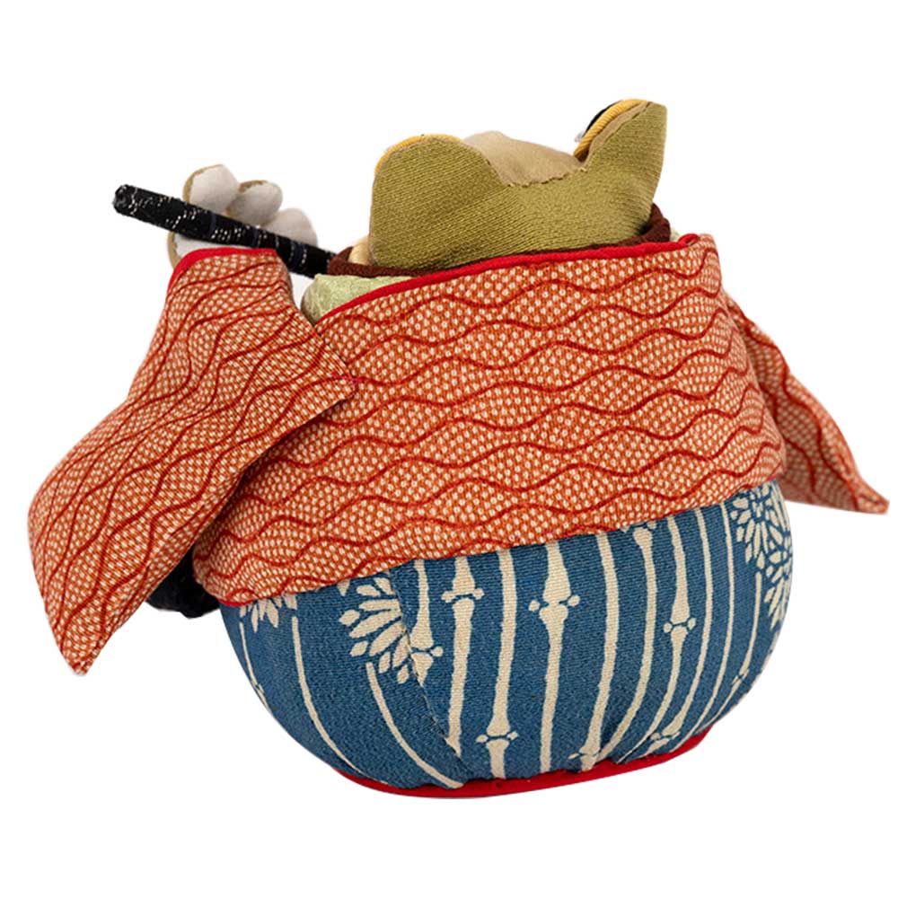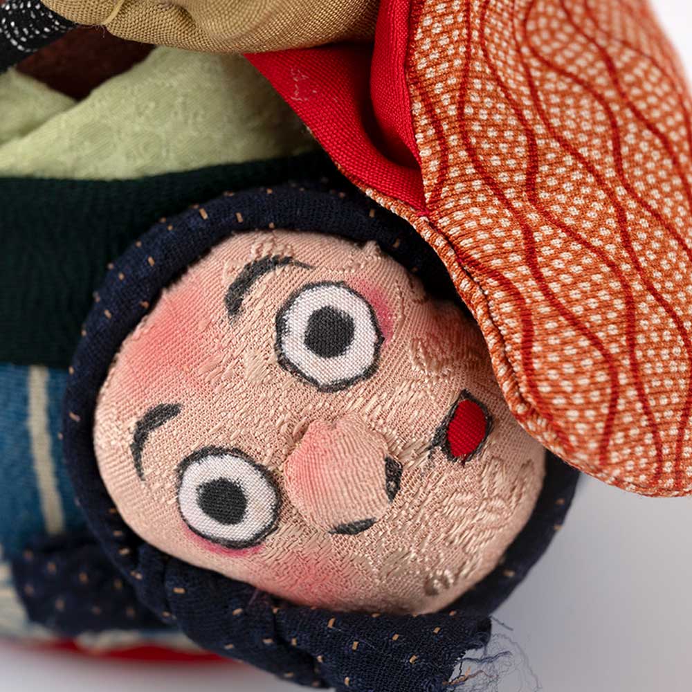 【キット作り方つき】【古裂】笛の音に誘われて幸運がやってきそう。「無事帰る」「若返る」などの語呂合わせも縁起がいい、お祝いにもぴったりなカエルの置物です。腰のひょっとこのお面もユニーク。