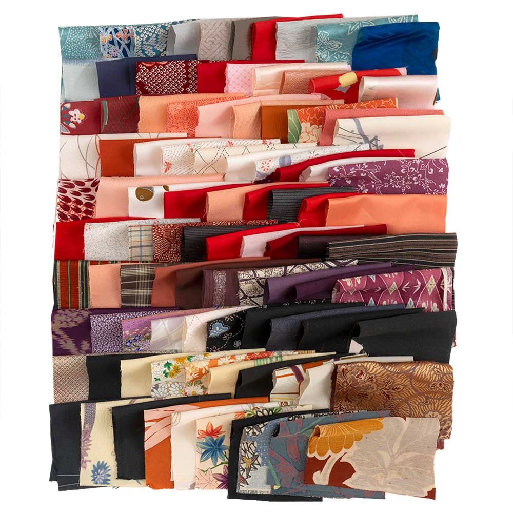 【古裂】幅広い色柄の古裂を100枚セットでお届け。ほとんどが絹で、化繊も入っています。お細工物や押し絵に。アップリケや押絵に。