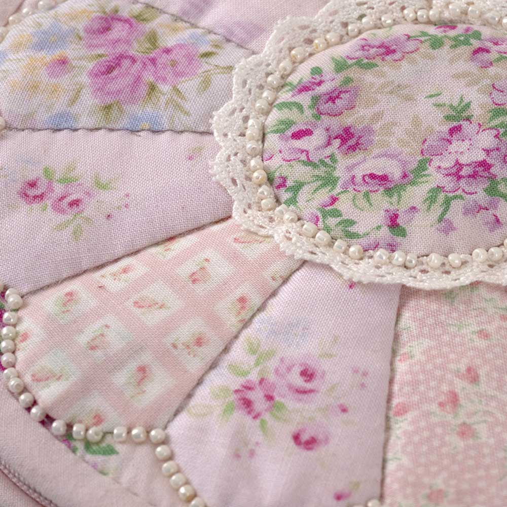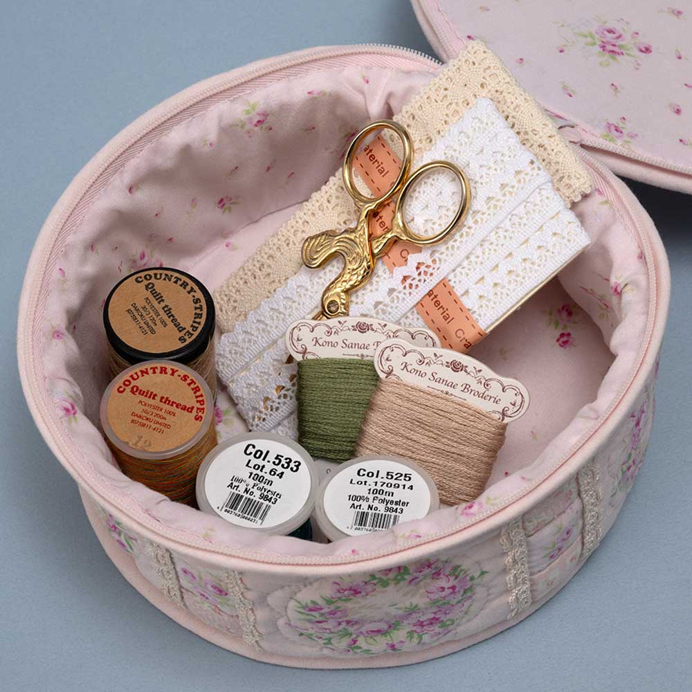 【キット作り方つき】糸巻きやはさみなどソーイングツールの収納にぴったり。バラ柄プリントを生かした、ドレスデンプレートのパターンで作るエレガントなケースです。