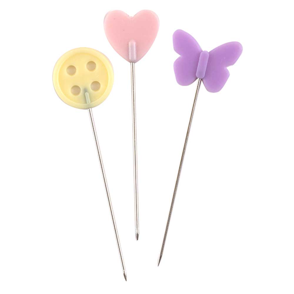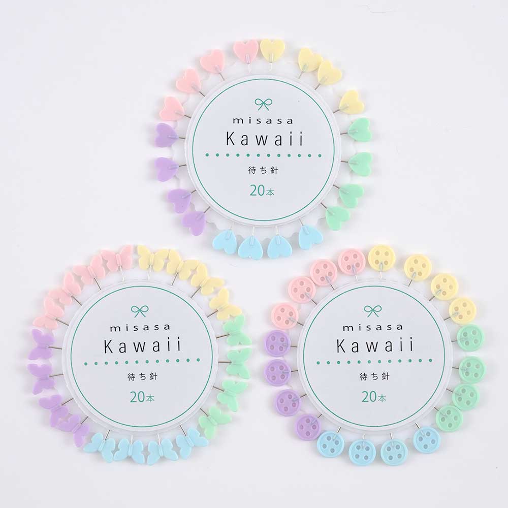 パステルカラーのヘッドが愛らしい、ハート・バタフライ・ボタンをモチーフにした待ち針セットです。ピースワークやソーイングに。1デザインにつき5 色・各4 本計20 本入りです。