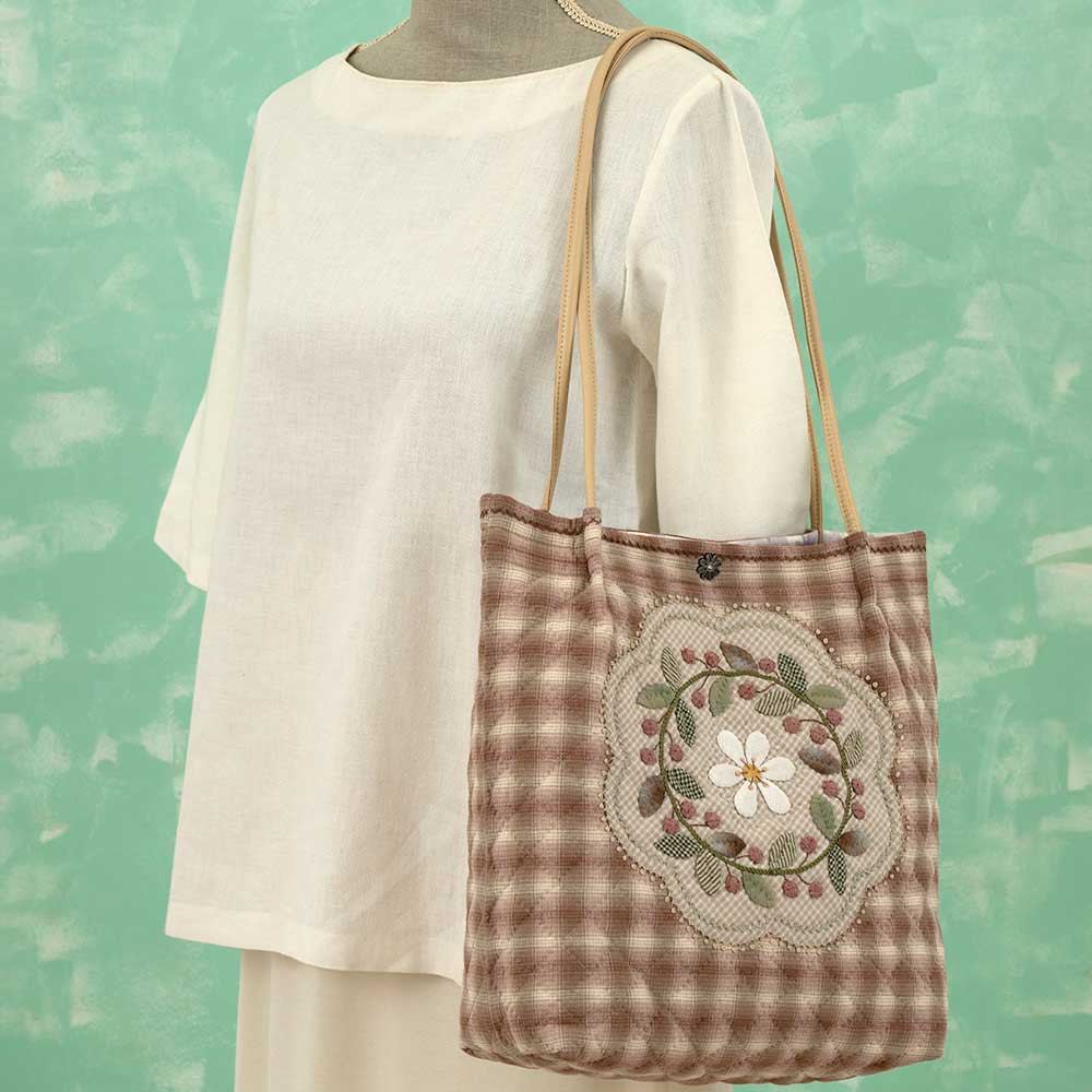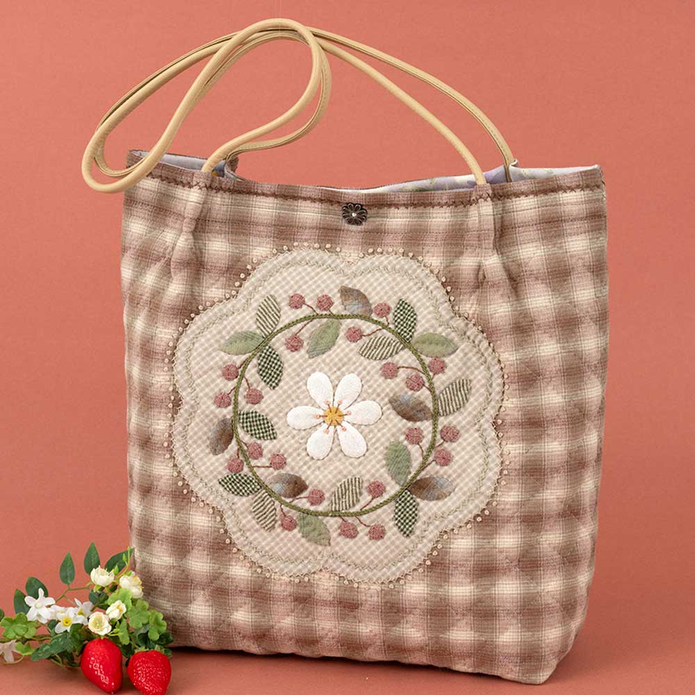 【キット作り方つき】赤系の先染め布のベースに花と実のリースをアップリケ。お揃い風の飾りマグネットボタンを合わせます。持ち手もセットでお届け。後ろは1枚布です。