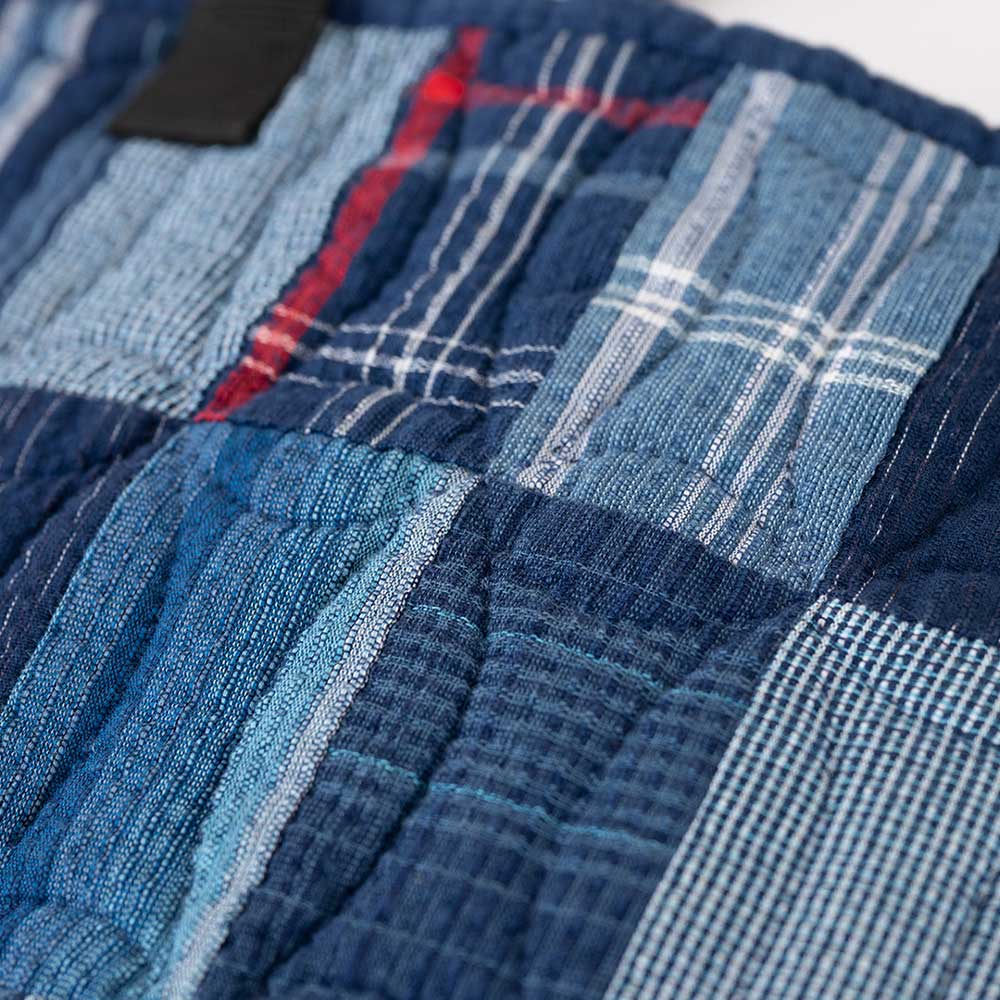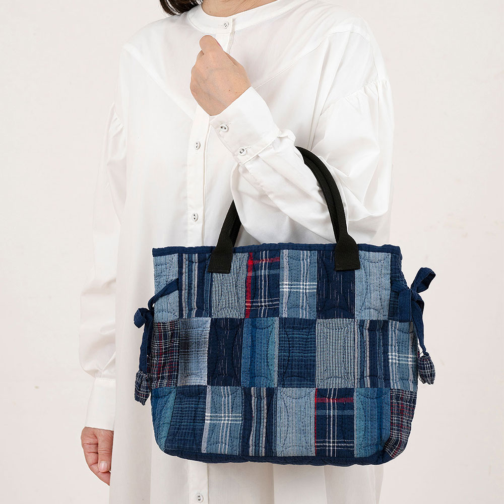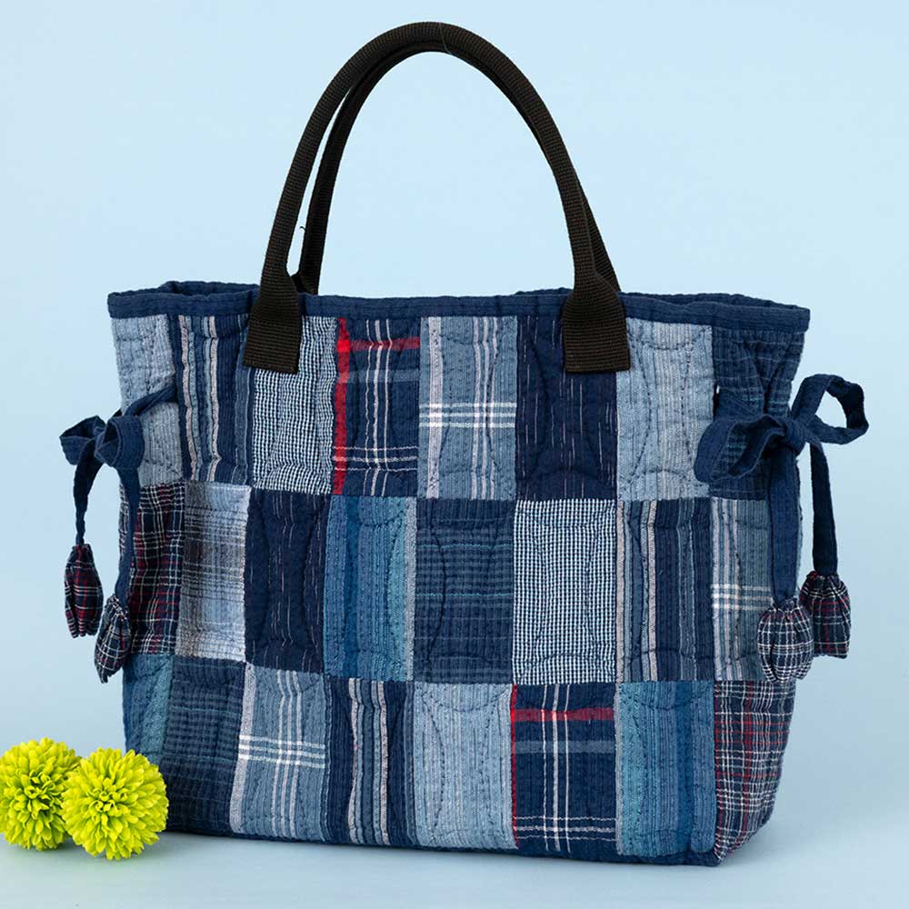 【キット作り方つき】阿波しじら織のピースワークで作るシンプルな四角つなぎのバッグ。濃淡の異なるブルーやチェックを組み合わせます。両サイドのリボンで大きさを多少調節できます。曲線のキルトラインで優しい印象です。反対側も同じでデザイン。