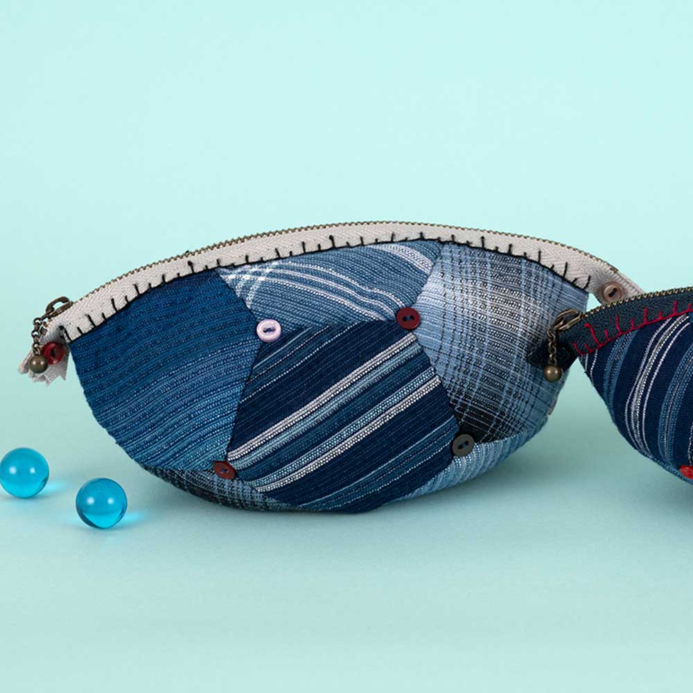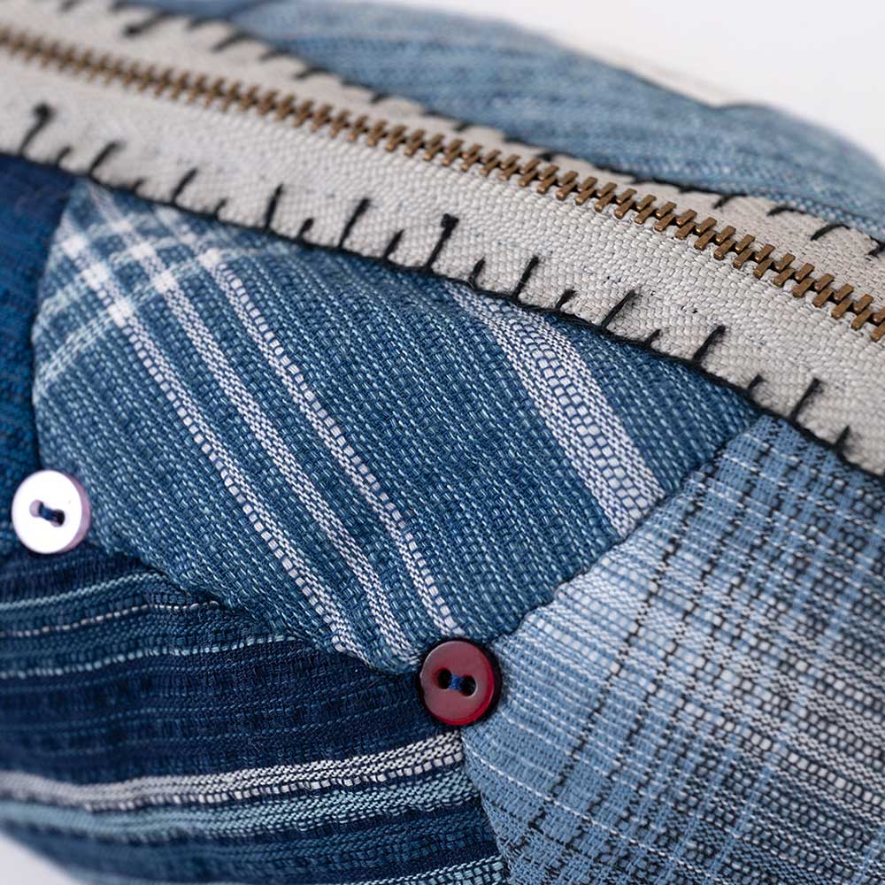 【キット作り方つき】様々な柄の紺のしじら織のピースをつないで、ころんとした形に仕上げるポーチ。サイズ違いで2種ご用意しました。飾りボタンやメジャーをイメージして刺しゅうしたファスナーがポイントです。