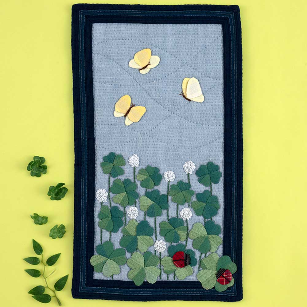 【キット作り方つき】しじら織の色柄を生かして四つ葉のクローバーをアップリケ。チョウやテントウムシも舞い降りて、幸せを運んでくれそうです。