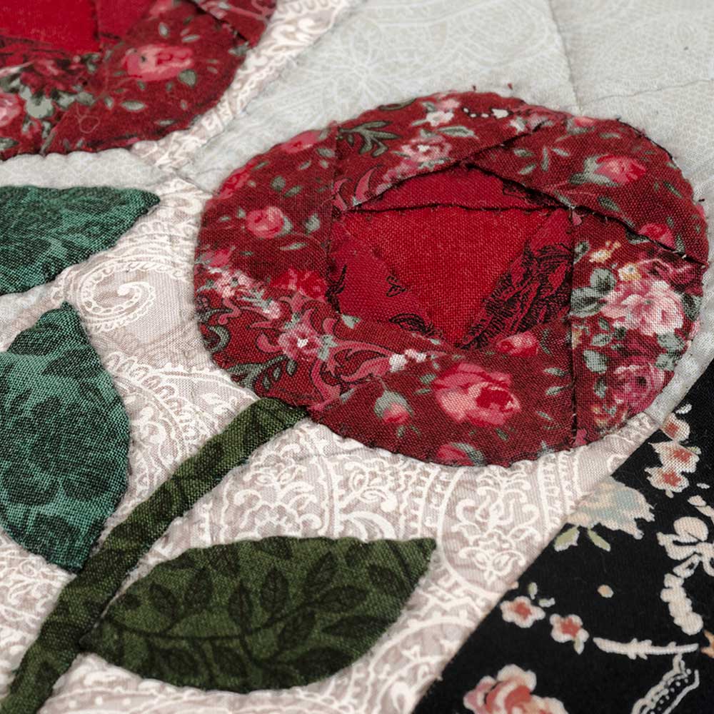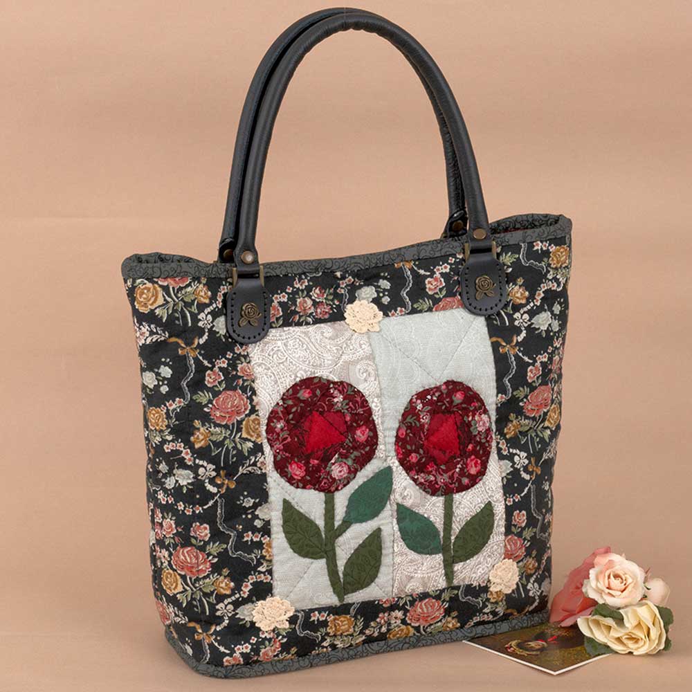 【キット作り方つき】シックなバラ柄とレース模様の布を合わせた本体に、ピースワーク仕上げのバラをアップリケ。モチーフレースもポイントです。後ろも同じデザイン。