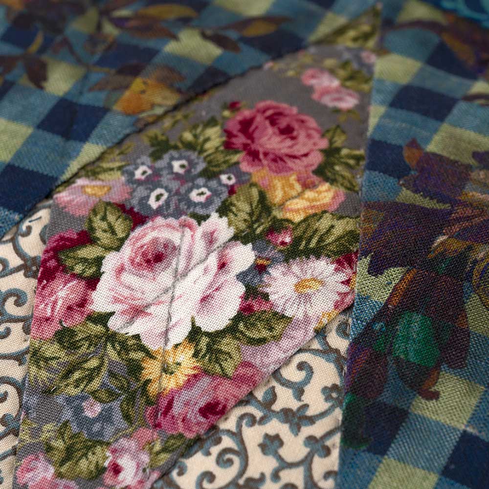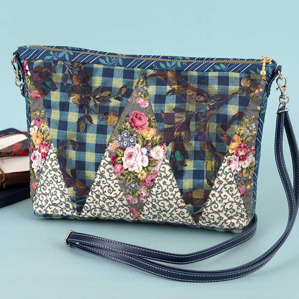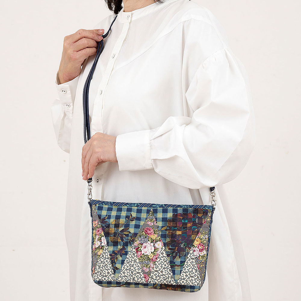 【キット作り方つき】前後とも同じ、チェック柄と花柄の大きめのピースを合わせて作るショルダーバッグです。ちょっとした外出にも重宝します。