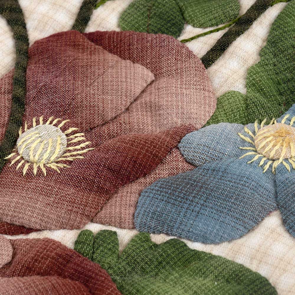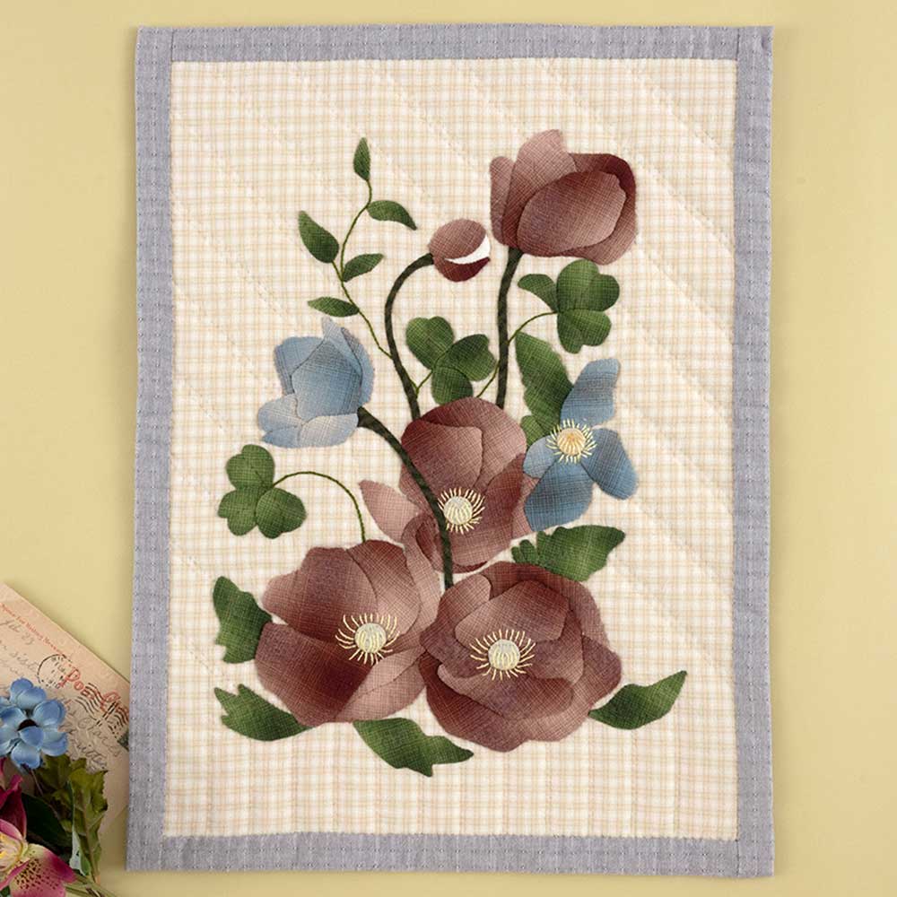 【キット作り方つき】はっきりとした色の先染め布で、ポピーをのびやかにアップリケしたタペストリー。飾ったときに、春らしく心地よい気持ちになれそうです。花芯は刺しゅうで仕上げます。