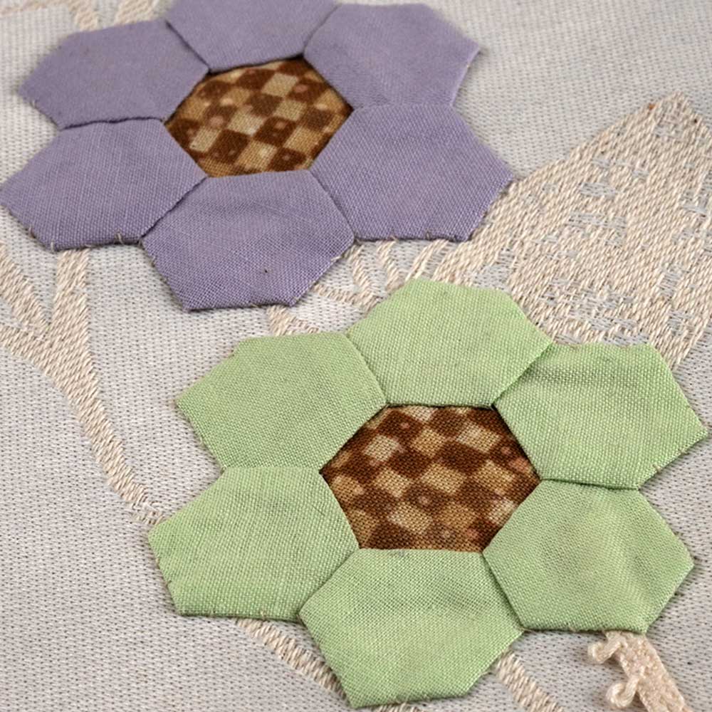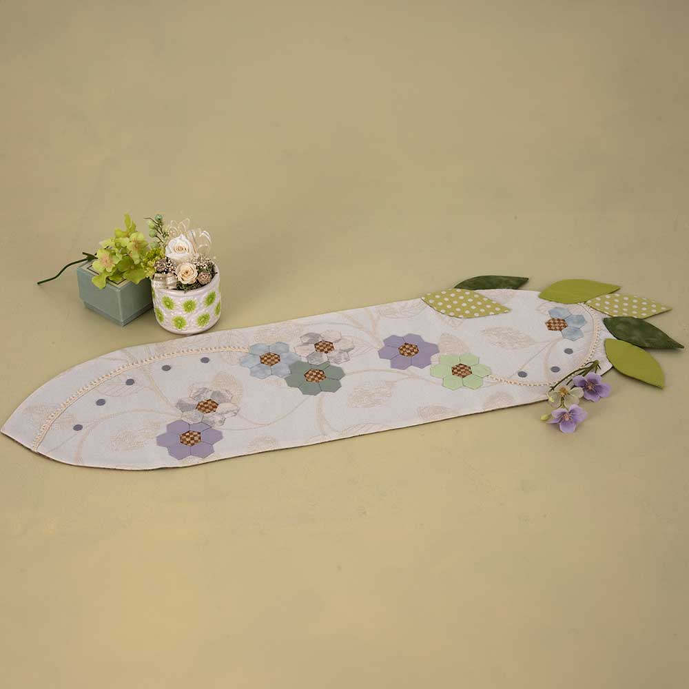 【キット作り方つき】高級感のあるインテリアクロスに、リーフとピースワークしたヘキサゴンの花をアップリケして作ります。キルト芯を使わないすっきりとした仕上がりです。リーフの地模様入りの地にパステル調の布でアップリケします。