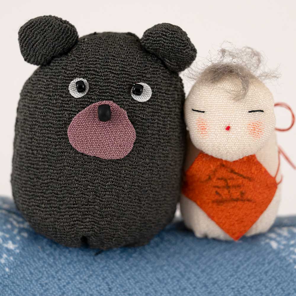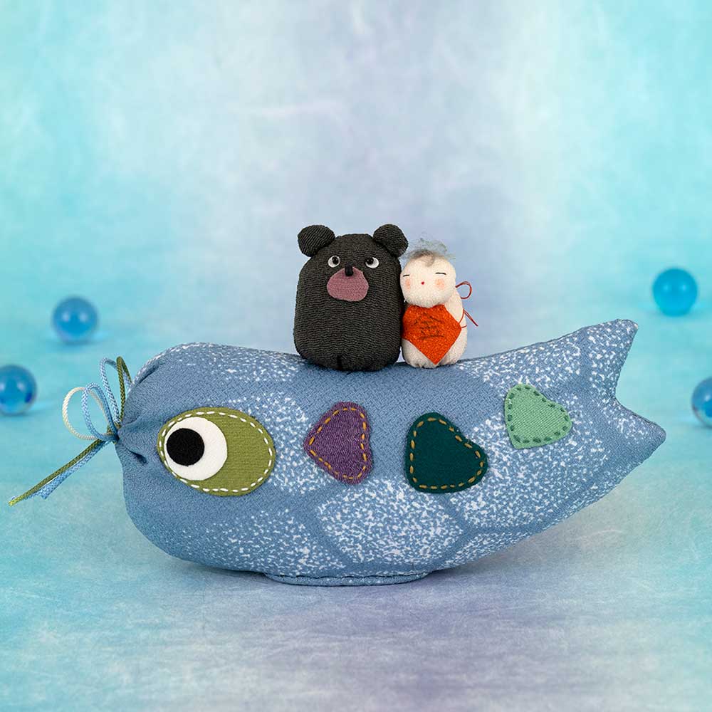 【キット作り方つき】【古裂】シンプルな作りのコイに、金太郎とクマがちょこんと座る可愛い飾りです。コイのひげは結んだコードで仕立てます。
