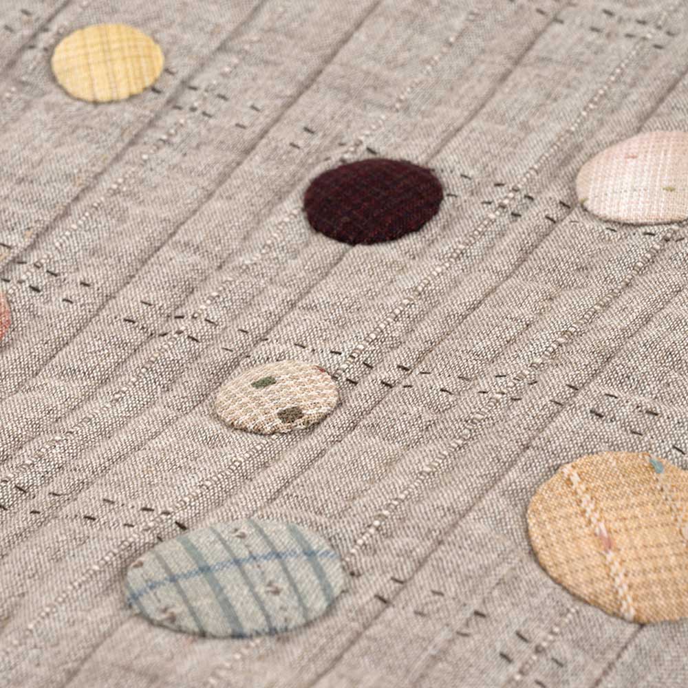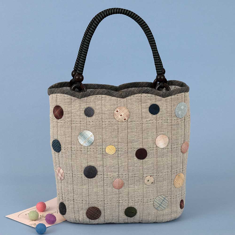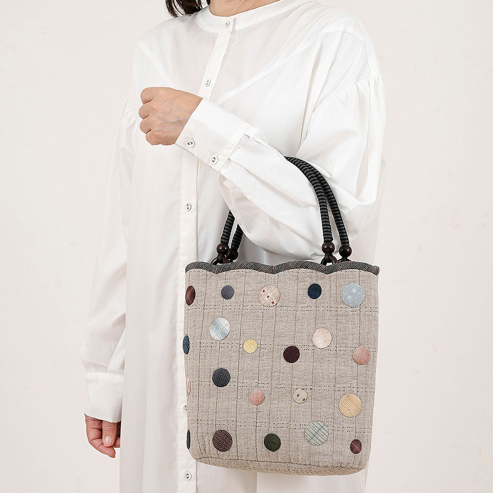 【キット作り方つき】前後とも泡のような大小の水玉をアップリケして作る、だ円底のバッグです。先染め布の落ち着いた色合いとスカラップの入れ口で、“ 大人可愛い” 仕上がりが楽しめます。