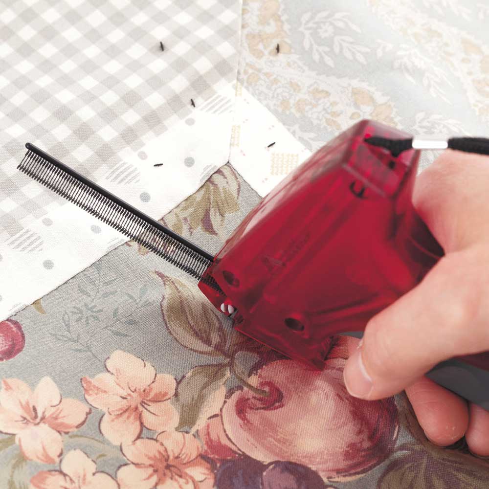 しつけツール・マイクロステッチのニューバージョンです。専用ピン「マイクロファスナー」をセットしてレバーを握ると、簡単に仮止めできます。