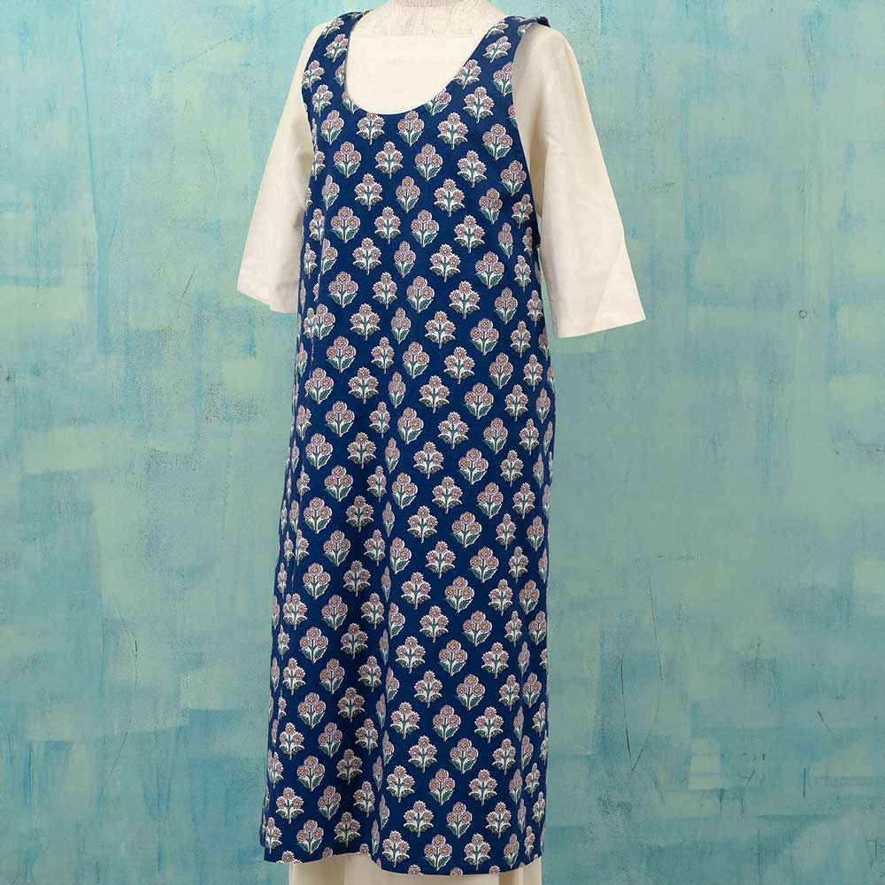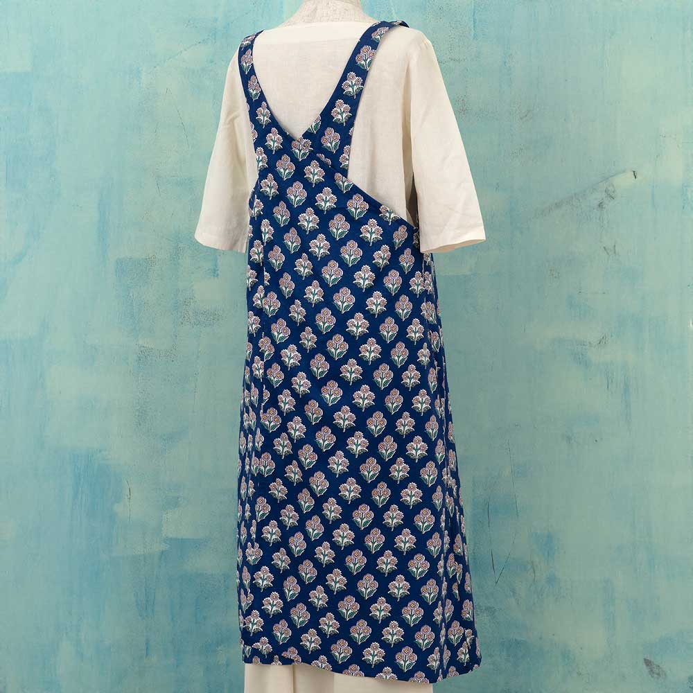 ●完成品●ネイビーブルーの地に小花を描いた、ワンピースタイプのエプロンです。ちょっとした外出にもOKのワンマイルウェアです。人気のかぶるだけのワンピース型エプロンなので、着心地も良くフェミニンな印象です。