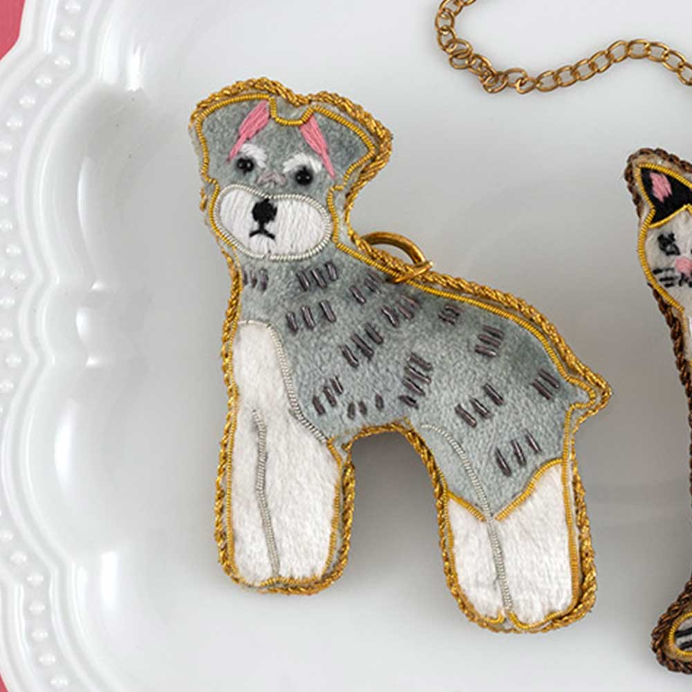 ●完成品●インドに古くから伝わる装飾技法のザリ刺繍の技法で、ひと針ひと針手作業で縫い付けたミニチュアシュナウザー柄のキーチャームです。お揃いのトートバッグとあわせて使うとさらにキュートに。