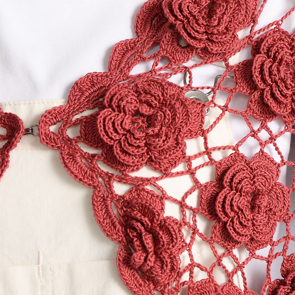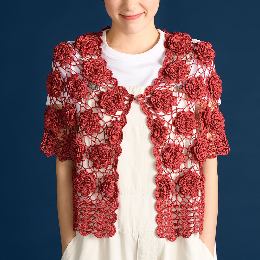 【キット作り方つき】つるのようなネット編みのベースに、存在感のある八重の立体花モチーフを咲かせた半袖カーディガン。シンプルスタイルに花を添える、アクセサリーとして羽織っても素敵な1着です。上級の方にお勧めします。