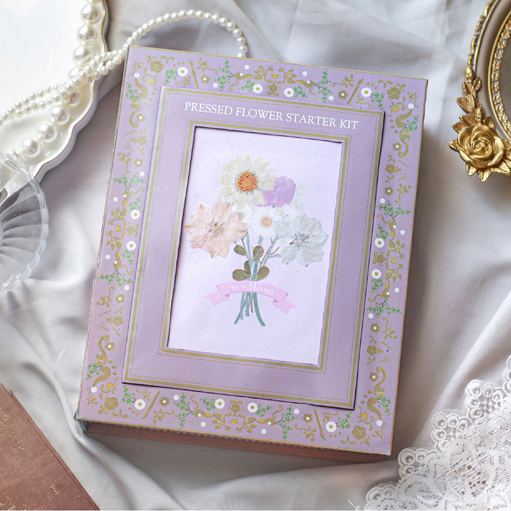 パッケージは洋書型のBOXとなっており、余った材料やレジンの道具を収納できる仕様になっています。また、パッケージ表面のポケットには作った押し花ポストカードを入れてそのまま飾ることができます。