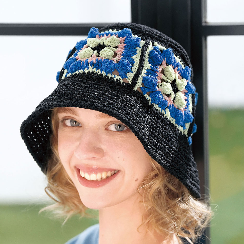 大きめのモチーフを大胆にサイドにあしらったバケットハットで印象的に。ふっくらとしたパプコーン編みがチャームポイントです。さらりとしたシャリ感のある和紙混のリリヤーンは春夏の帽子にぴったり。