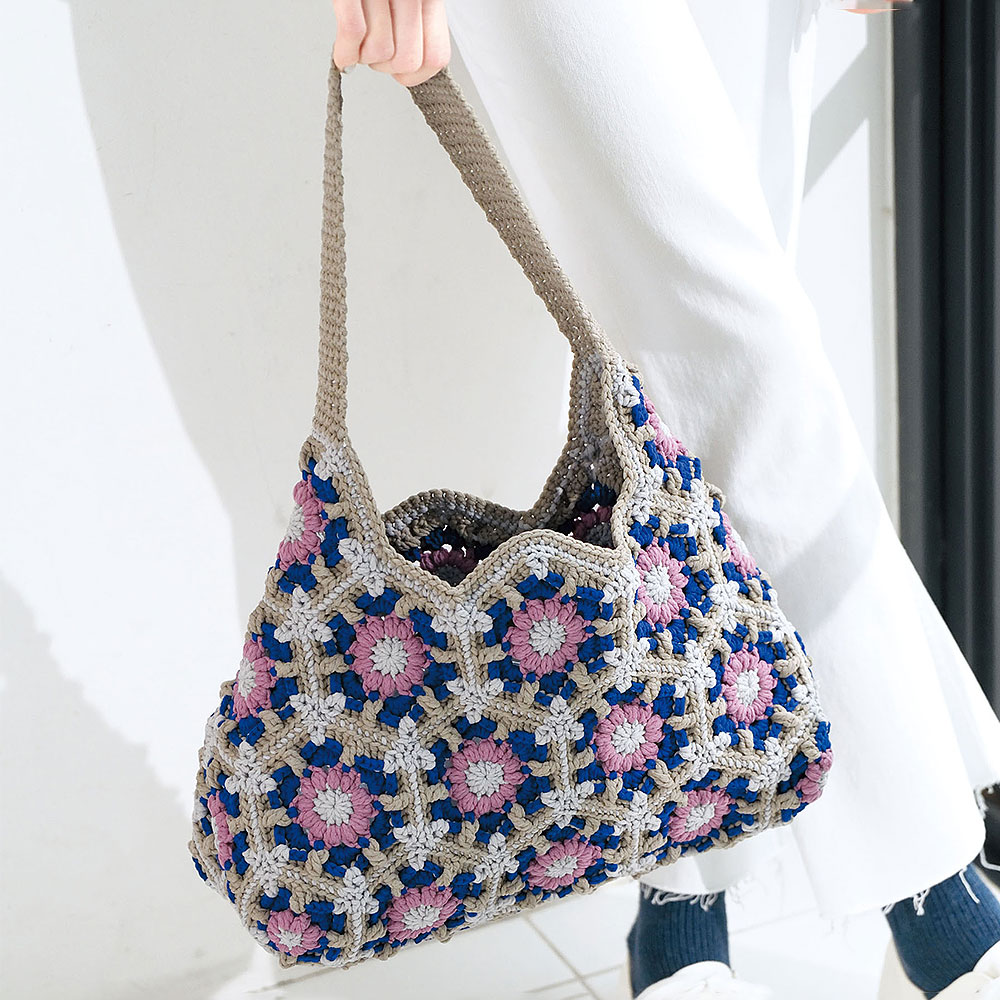 スポンジッシュな糸で編むモチーフは、とっても軽い! バッグにぴったりの密なモチーフも、軽くしっかり仕上がります。玉編みや引き上げ編みを使ってかちっと編んだモチーフバッグは、中袋なしでも大丈夫。モチーフの最終段を編み込みにすることで新鮮な表情になります。