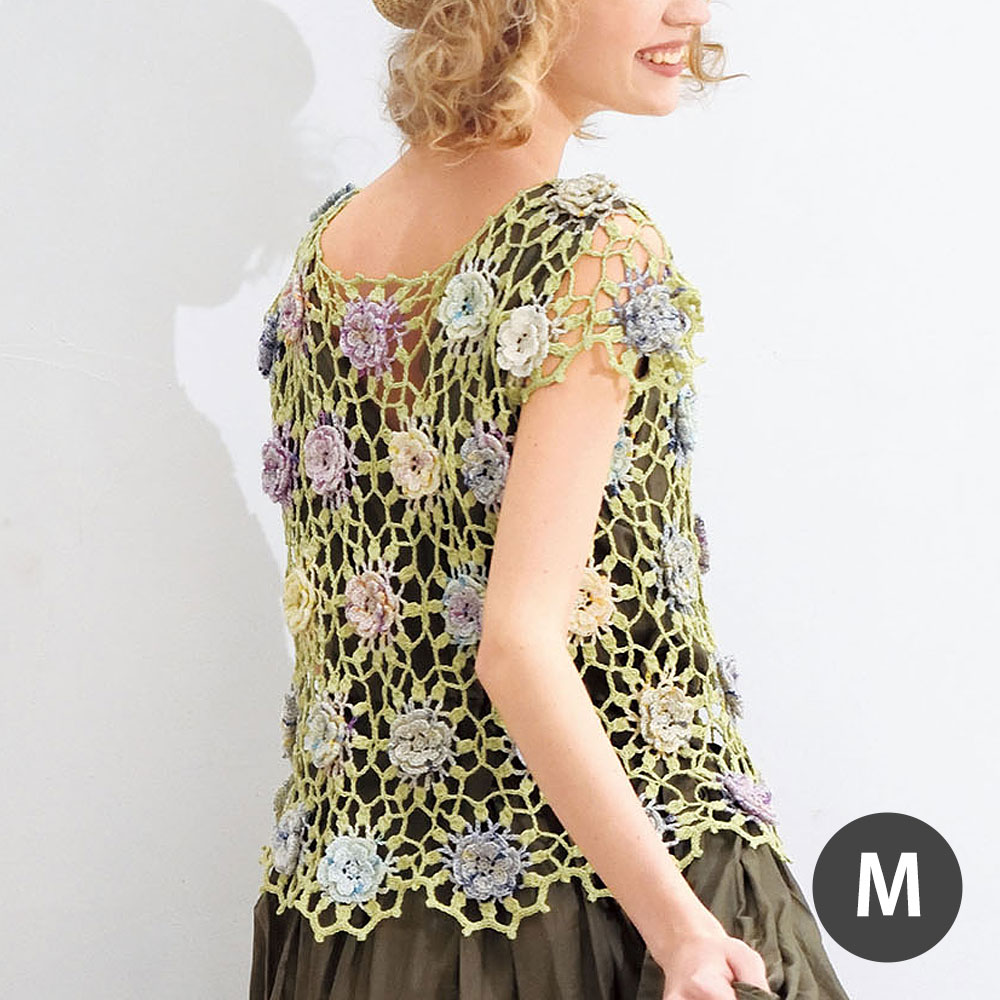 花畑をまとうような可憐なモチーフつなぎ。立体的な中心の花モチーフは穏やかに変化するロングピッチの段染め糸を使っているので、配色しなくてもいろんな色が楽しめます。最終段をグリーンでまとめることで、つないだときに葉っぱと蔓のように見えてきます。モデル着用はLサイズ。