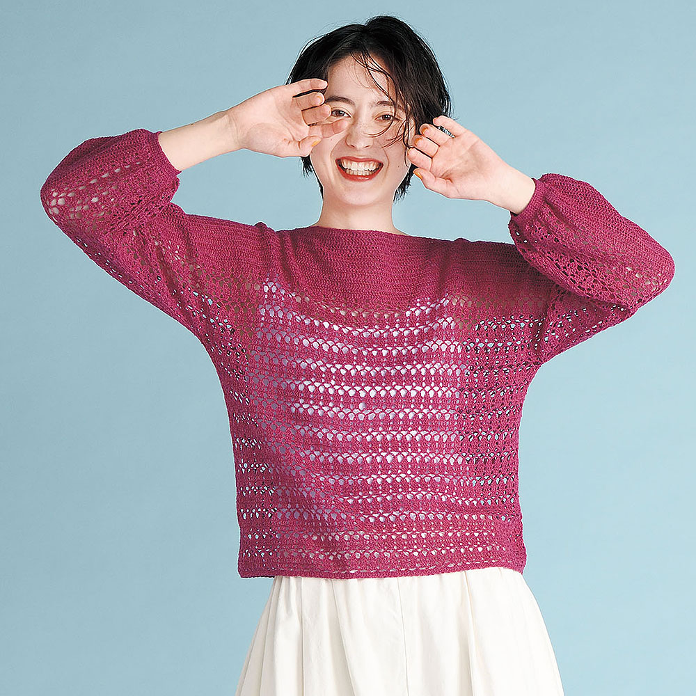 編み目の増減がなく、すべてが直線で構成されたT字型ウエア。でも細めのしなやかな糸で編んでいるから、着たらこんなに自然です。鎖編み、細編み、長編みが 編めれば大丈夫。袖口はきゅっと絞ってかわいく仕上げて。