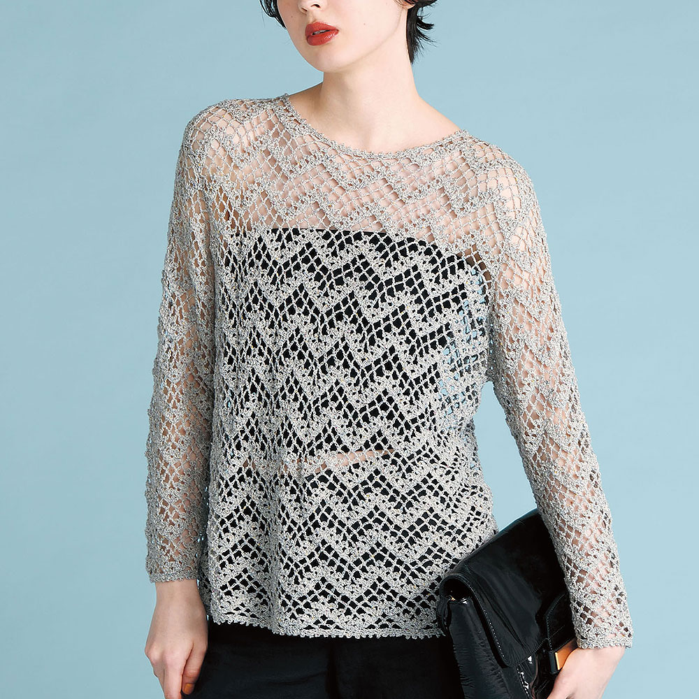 ダイナミックなジグザグ模様は、ネット編みの中に玉編み模様で描きます。袖山を作って袖つけもする、セットインスリーブのクロッシェウエアです。袖ぐりと衿ぐりの減目、袖下の増し目や袖山の減目はすべて図解があるので、ちょっと背伸びしたい方も編めますよ。