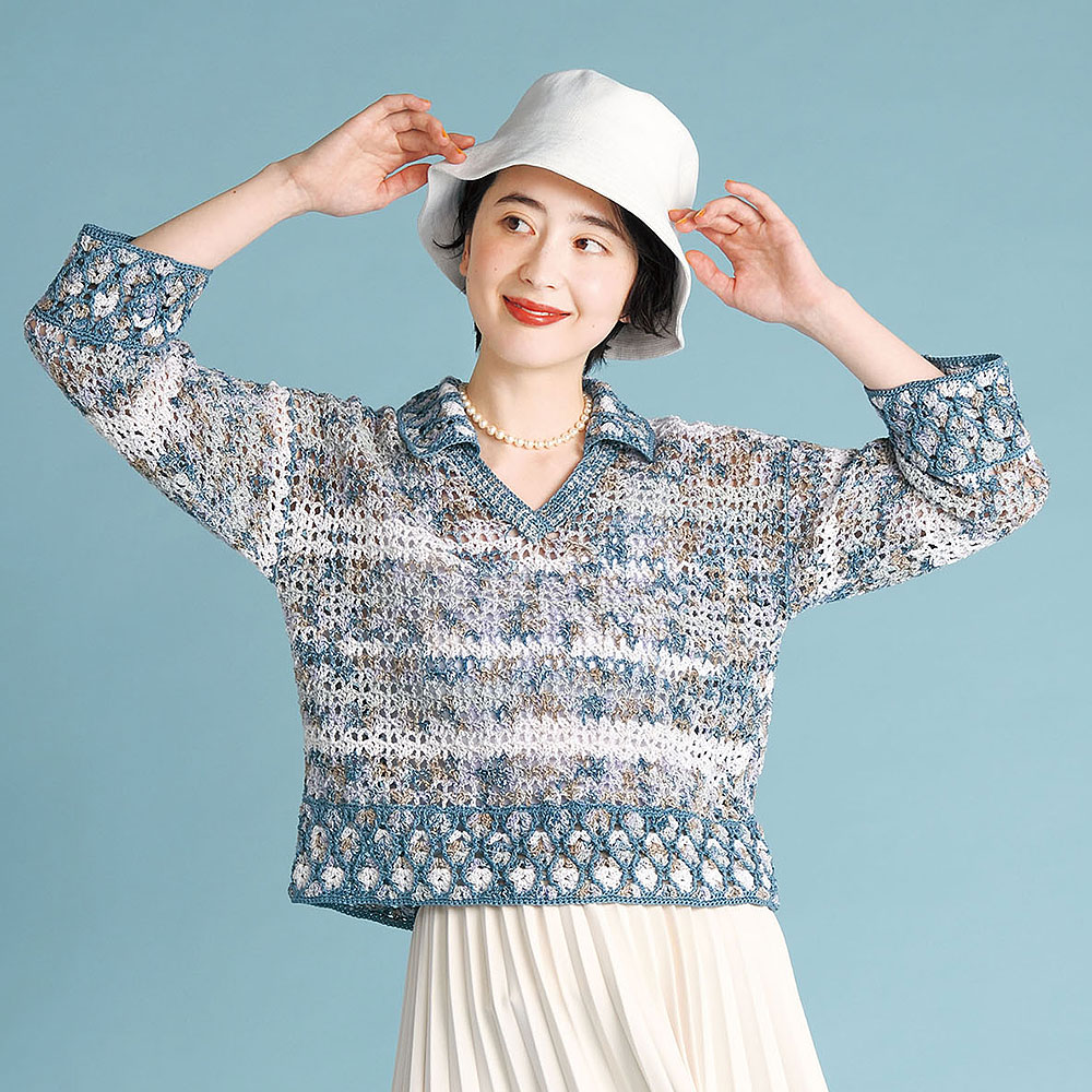 メインの模様はシンプルですが、裾や袖口、衿は編み込み模様+引き上げ編みで難易度アップ。でもこのトリミングがデザインを引き締めているので、ちょっと頑張って編みましょう。肩下がりのあるきれいなラインとVネック、しっかりした衿もポイントです。