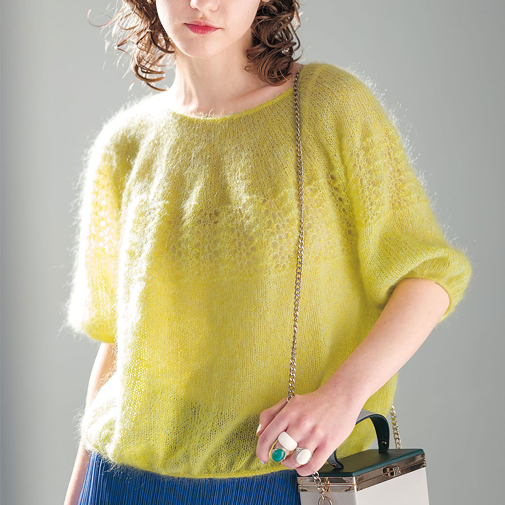 アイコードで絞った袖口&裾のシルエットがチャーミングな丸ヨーク。鮮やかな春色カラーが映える、上品な光沢もモヘアヤーンの推しポイントです。胸元に入れた穴あき柄も毛足のおかげで程よい透け感が楽しめます。