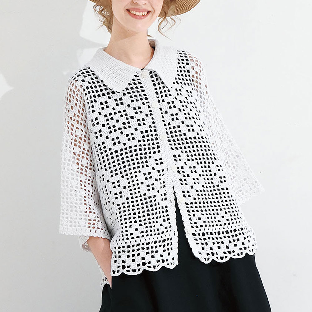 方眼編みのベースを長編みでブロック状に埋めて、大きな花を並べたカーディガン。清楚なホワイトにレースの透け感が美しく、気分も浮き立ちます。かっちりと編んだ細編みの衿がアクセントになって全体を引き締め、きちんとした印象に。
