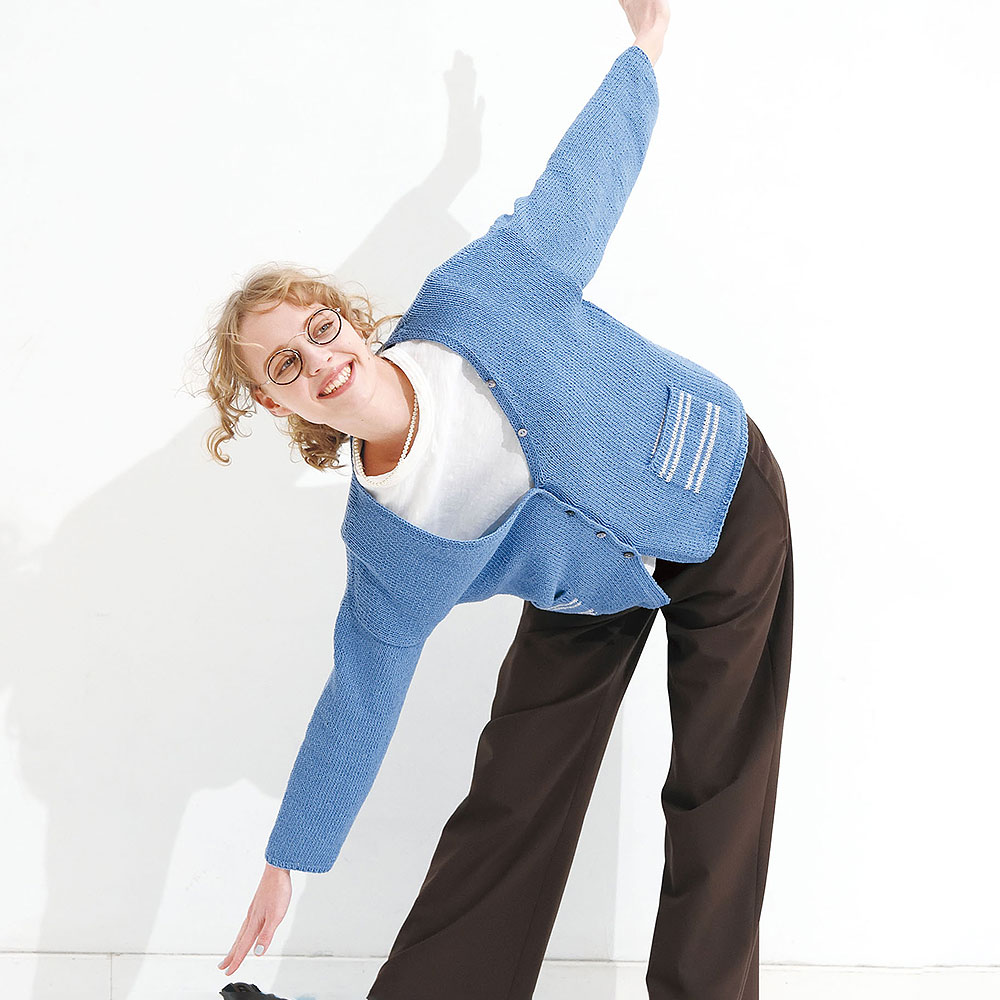 クセがなく着こなしやすいメリヤス編みのYネックカーディガンは、爽やかなダブルストライプがセールスポイント。1目ゴム編みから編み上げて、前立て部分も一緒に編んでいきます。袖ぐりもまっすぐなので、編むのも仕上げも楽々です。