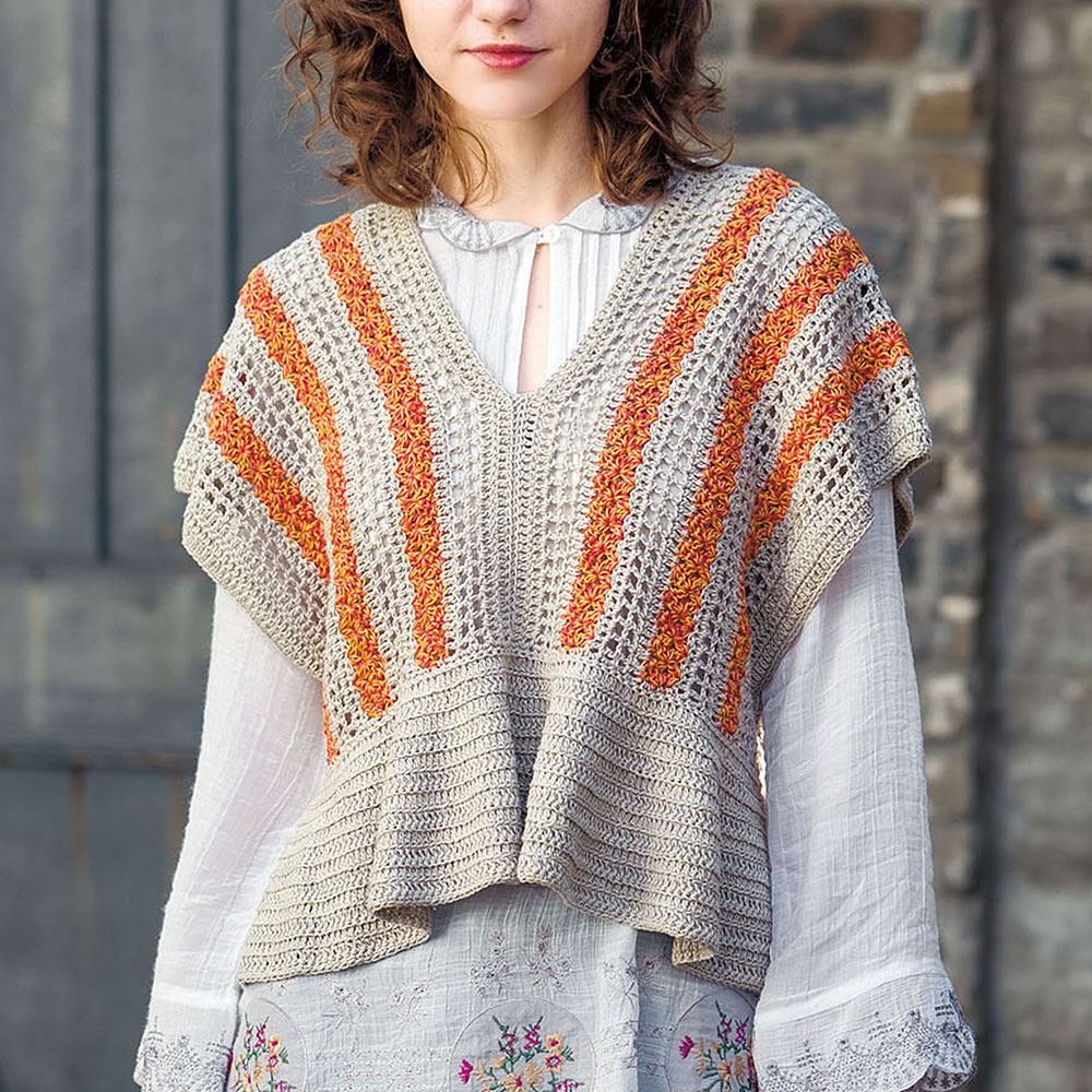 体に沿うように落ちるドロップショルダーは、2 枚の長方形をつないで作ります。横編みだから透かし模様の縦縞も簡単です! 豊かなフリルを編み出して、編み終わったらできあがり。