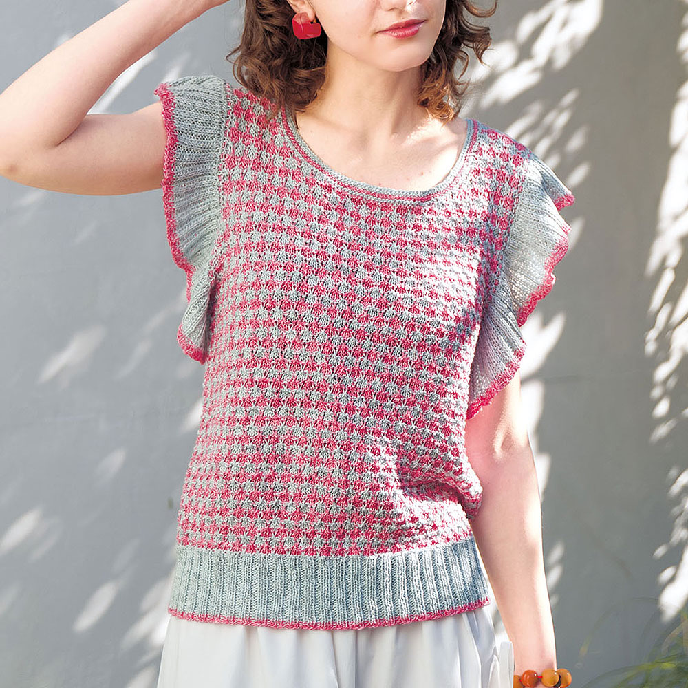 すべり目の縞が作り出すニュアンスのある市松模様に、大きなフリル袖が目を引くベスト。たっぷりフリルは気になる二の腕のカバー効果もあり、印象的な配色はシンプルに着るだけで華やかな装いに。