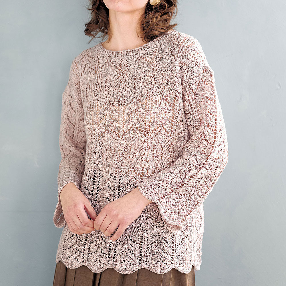 身頃全体の模様は、木の葉模様と、楕円の中に編み下がるボップルを蕾、ジグザグを蔓に見立てて植物をイメージした柄、この2種の模様のくり返しで全体を構成してみました。身頃は袖つけ止まりの両サイドで2目の伏せ目をします。袖は木の葉模様のみで編みますが、袖下の上部で段階的に裏目で3目を増します。