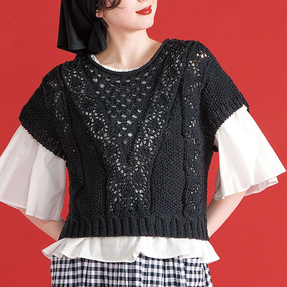 センターにV 字に入れた透かし模様がインパクト大。 重ね着で長く着られ、ボトムを選ばない万能アイテムになりそうです。