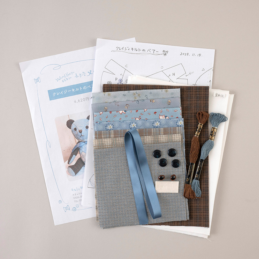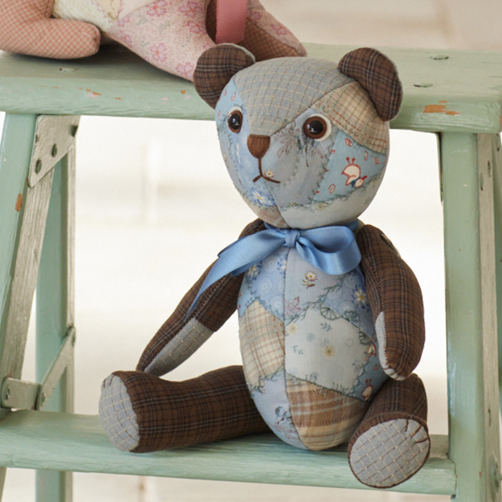 【キット作り方つき】ボディーがクレイジーキルトのくまのぬいぐるみです。キルト芯に布を直接縫いつけて仕上げていきます。