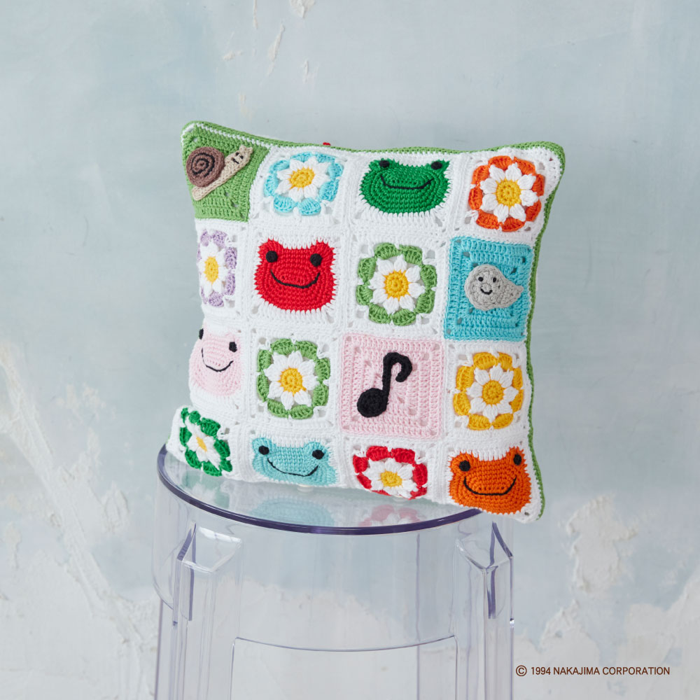 さらに、編んだモチーフと同シリーズのモチーフを組み合わせて(合計32枚使用)、クッションカバーが作れます。