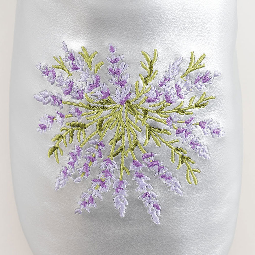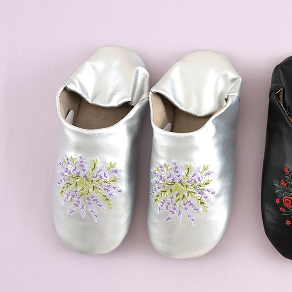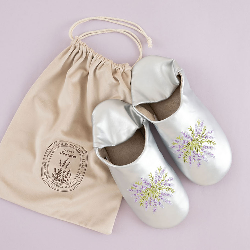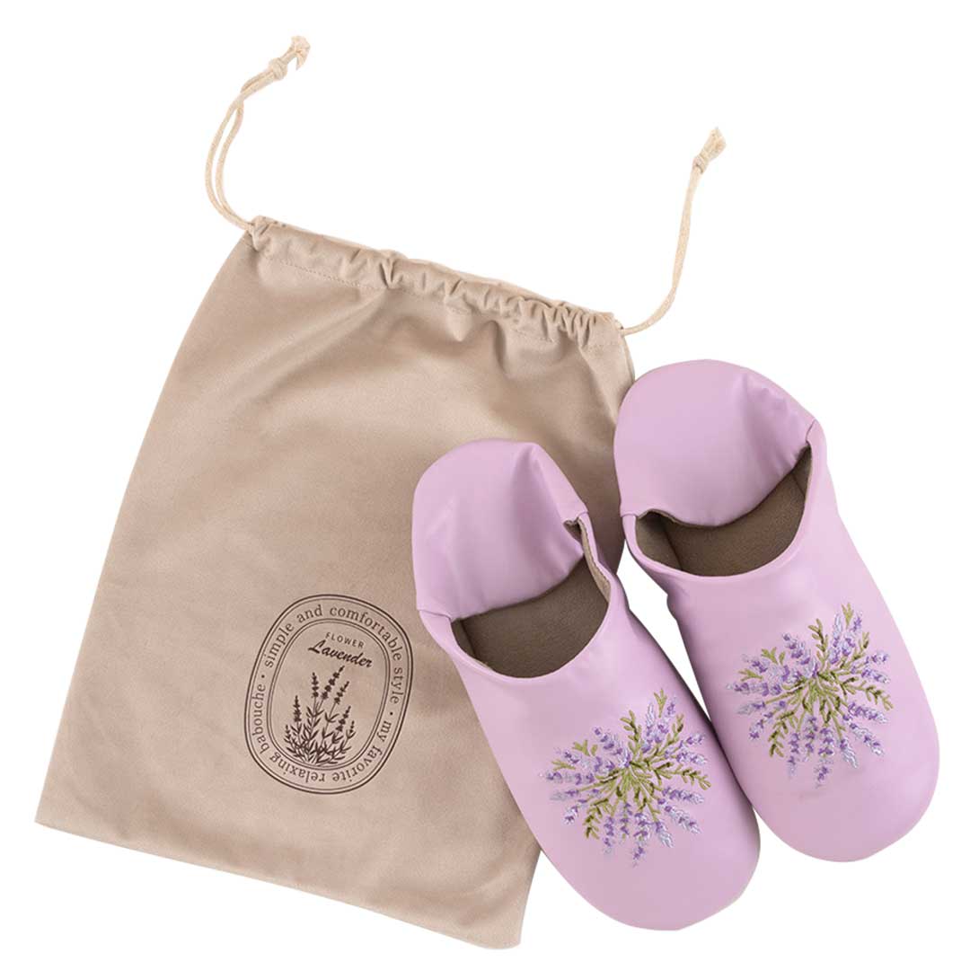 ●限定50●完成品●繊細なラベンダーの刺しゅうがさわやかな印象の室内履き、バブーシュ。バブーシュとは元々モロッコの物でペルシャ語で「足を覆う物」という意。合皮で扱いやすく、柄も生活に取り入れやすくアレンジしました。かかとを踏んで楽に履けるのがポイントのおしゃれな室内履きです。しっかりとした袋入りで持ち運びにも。