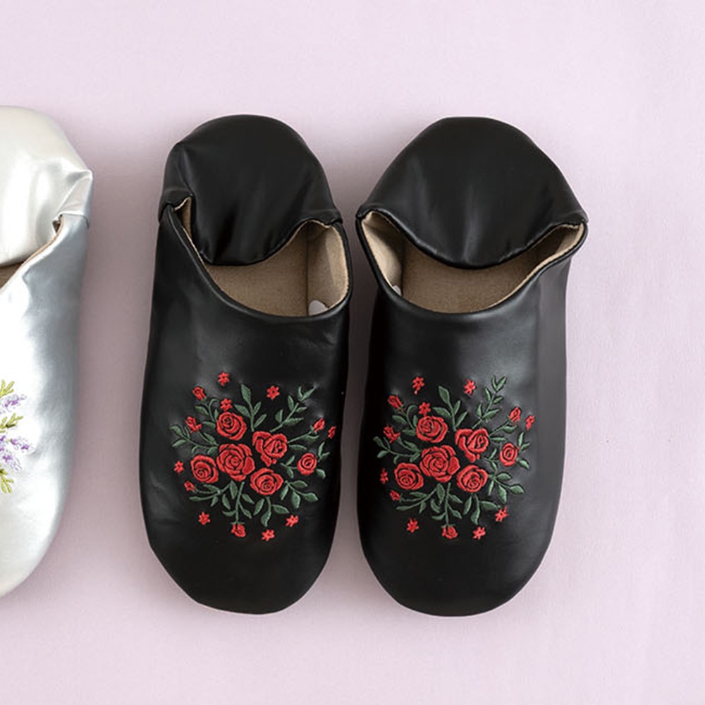 ●限定50●完成品●繊細なラベンダーの刺しゅうがさわやかな印象の室内履き、バブーシュ。バブーシュとは元々モロッコの物でペルシャ語で「足を覆う物」という意。合皮で扱いやすく、柄も生活に取り入れやすくアレンジしました。かかとを踏んで楽に履けるのがポイントのおしゃれな室内履きです。しっかりとした袋入りで持ち運びにも。