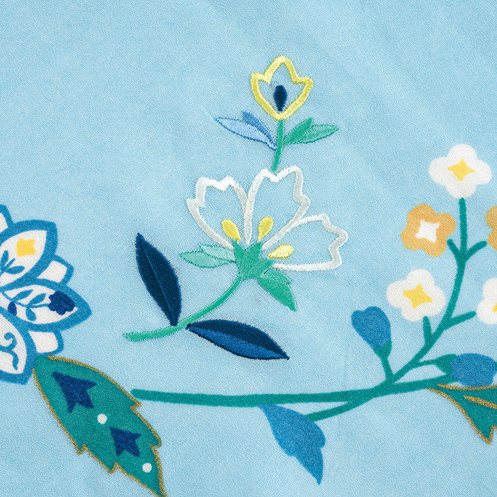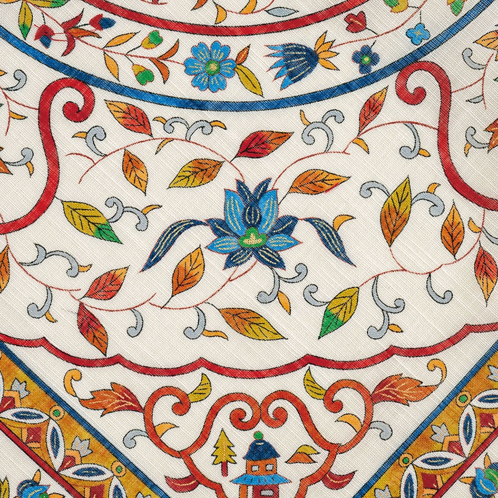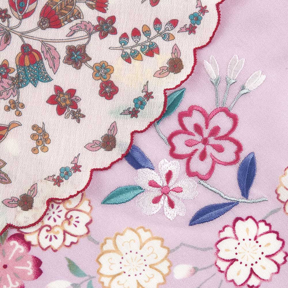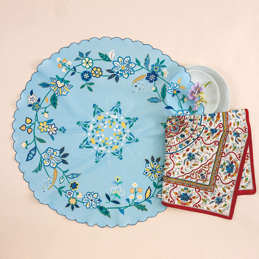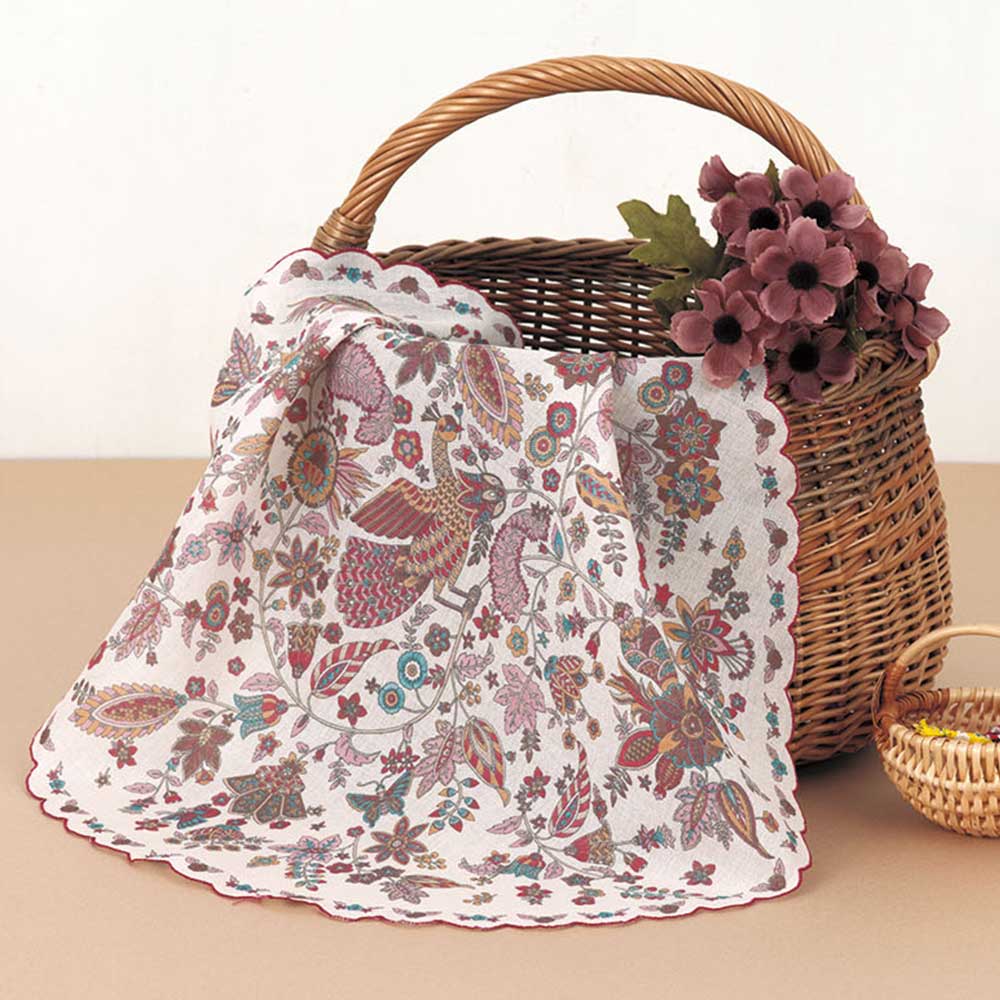 【完成品】更紗柄の花がリース状にデザインされた丸い形のハンカチと、オリエンタルな唐花文様を描いた50センチ角のハンカチの2枚セットです。マルチクロスとしてかごにかけたり、飾ったりしても。贈り物にも。暖かくなる春のお出かけのお供に。
