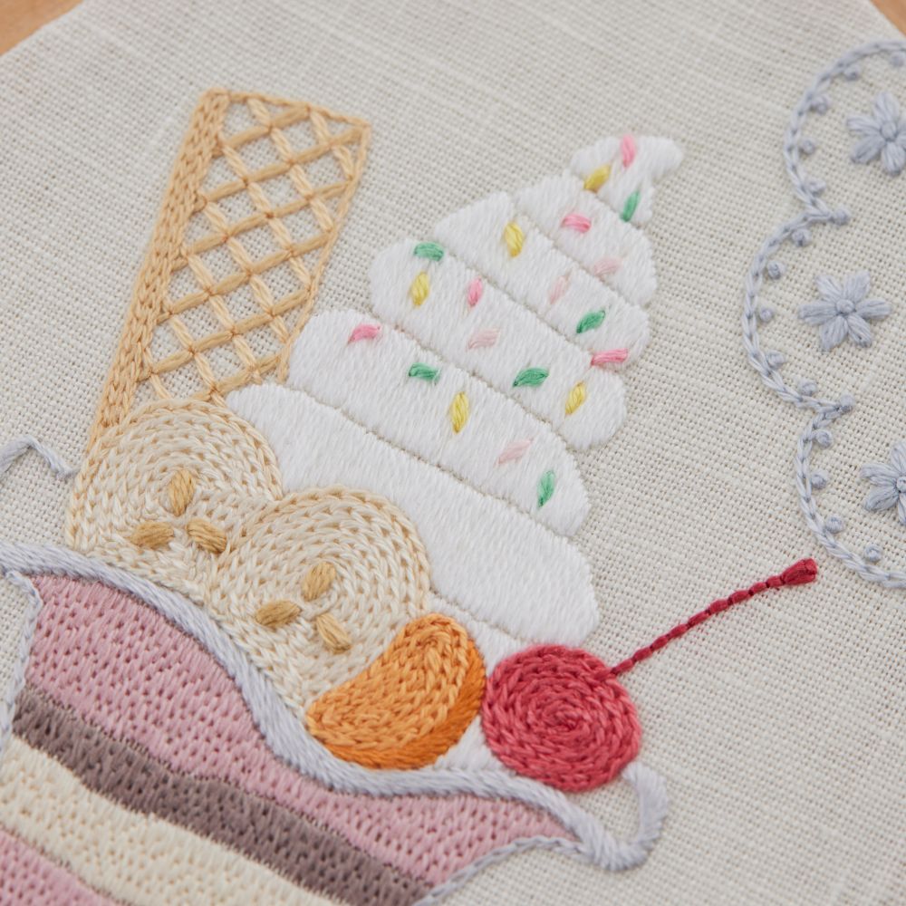 チェーンステッチで面を埋めたり、サテンステッチの刺す向きでソフトクリームを表現したり、bitteさんならではのステッチテクニックがたくさん詰まっています。
